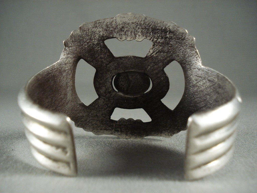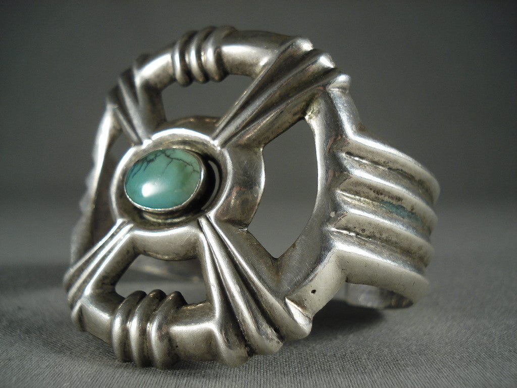 This is an amazing vintage Navajo silver bracelet. The turquoise stone is a lovely shade of aqua, surrounded with silver rays bursting forth to the four corners. The cuff gives an illusion of having four beveled rails. The center stone measures around 1/2" x 5/16". The width of the bracelet measures around 2". Sterling silver. Cir. Mid Century. The inside end to end measures around 5-3/8" with an additional 1-1/8" gap. Sturdy 74 grams. LAYAWAYS- We are happy to work with you and are more flexible than anyone on the net. Simply send us an email for more information.Make Us an Offer- Due to the high demand of our items, many pieces sell quite fast. The most frequent email we receive are from buyers who waited too long to make us an offer and suddenly lost out because another buyer came in and purchased. Send us your reasonable offer today, we are flexible and you have nothing to lose! We also have layaway available and are happy to work with you. Send us an email for more details. Ahéhee’ (Thank you)