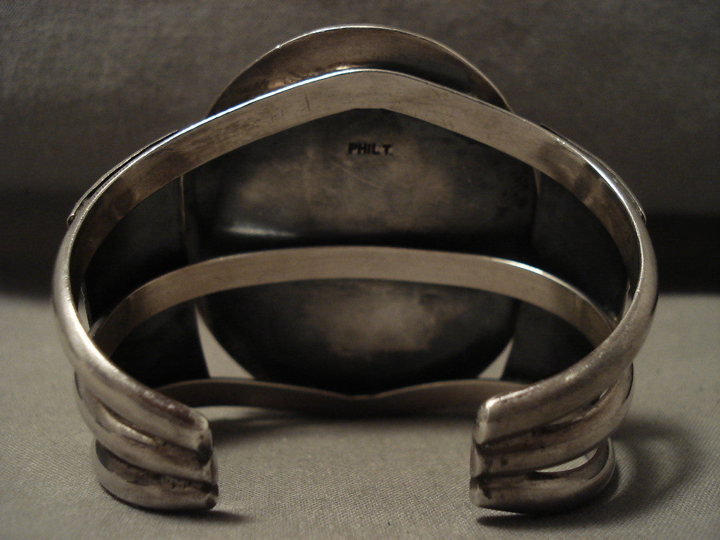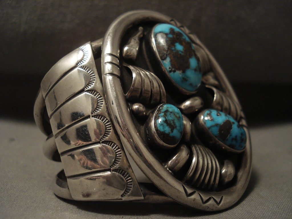 This is a museum quality vintage Navajo oppulant old silver bracelet. This piece contains three natural and huge Bisbee turquoise stones. These stones are high grade, very old and natural. Resting throughout the stones are marvelous silver fans with accenting silver bridges and raindrops. The bracelet includes a superior heavy triple silver shank cuff with two magnificent silver flanks on the ends. This bracelet is in absolutely perfect condition. The largest stone measures around 1" x 5/8". The width of the bracelet measures around 2-1/4". Sterling silver. Cir. Mid century . The inside end to end measures around 5-1/4" with an additional 1" gap. Sturdy 103 grams. LAYAWAYS- We are happy to work with you and are more flexible than anyone on the net. Simply send us an email for more information.Make Us an Offer- Due to the high demand of our items, many pieces sell quite fast. The most frequent email we receive are from buyers who waited too long to make us an offer and suddenly lost out because another buyer came in and purchased. Send us your reasonable offer today, we are flexible and you have nothing to lose! We also have layaway available and are happy to work with you. Send us an email for more details. Ahéhee’ (Thank you)