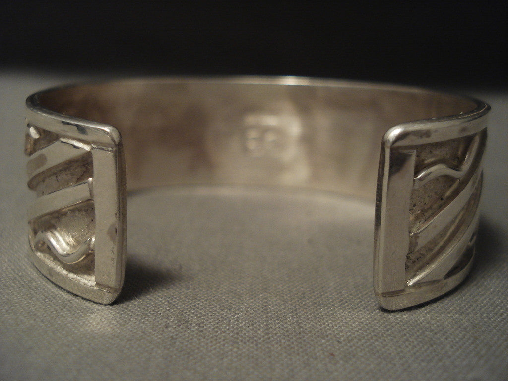 This is a remarkable vintage Navajo museum quality silver bracelet having five high grade old Easter Blue turquoise stones. The older high grade stuff is very hard to come by and so this piece is very rare and special. Located on the cuff are accenting silver raindrops with impressive silver snakes that rest on the ends. The center stone measures around 1/2" x 3/8". The width of the bracelet measures around 3/4". Signed by Navajo artist, Sammy Bahe. Sterling silver, marked. The inside end to end measures around 5-1/4" with an additional 1" gap. Sturdy 29 grams. LAYAWAYS- We are happy to work with you and are more flexible than anyone on the net. Simply send us an email for more information.Make Us an Offer- Due to the high demand of our items, many pieces sell quite fast. The most frequent email we receive are from buyers who waited too long to make us an offer and suddenly lost out because another buyer came in and purchased. Send us your reasonable offer today, we are flexible and you have nothing to lose! We also have layaway available and are happy to work with you. Send us an email for more details. Ahéhee’ (Thank you)