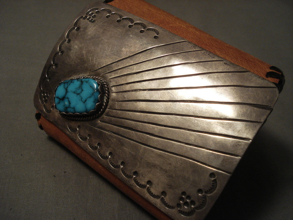 This is a magnificent vintage Navajo silver ketoh bracelet. This piece contains a very rare spiderweb turquoise stone. The stone is huge and appears to be symbolic of the sun. Look at that phenomenal spiderweb matrix, this stone appears to be from the fascinating Lone Mountain turquoise mine. The silver plate consists of remarkable old natural patina. Bordering the 4" X 2-1/2" huge silver plate are impressive silver sun patterns with accenting pounded dotted works. This piece will fit a wrist size of about 7-1/2" to 11". The center stone measures around 1" x 5/8". The width of the bracelet measures around 4". Sterling silver. Cir. 1930's+. Sturdy 115 grams. LAYAWAYS- We are happy to work with you and are more flexible than anyone on the net. Simply send us an email for more information.Make Us an Offer- Due to the high demand of our items, many pieces sell quite fast. The most frequent email we receive are from buyers who waited too long to make us an offer and suddenly lost out because another buyer came in and purchased. Send us your reasonable offer today, we are flexible and you have nothing to lose! We also have layaway available and are happy to work with you. Send us an email for more details. Ahéhee’ (Thank you)