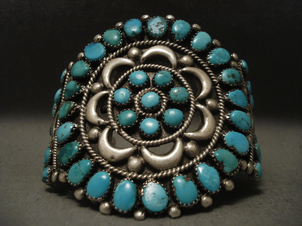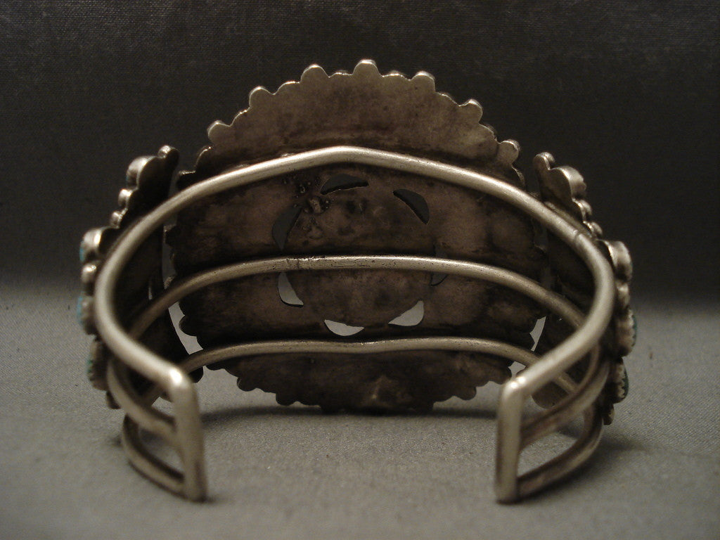 This is a remarkable vintage Navajo museum quality silver cluster bracelet containing both green and blue dome and round shaped turquoise stones. Wonderfully surrounding the center cluster of stones are stunning hand repoussed silver shells. This piece consists of a heavy triple silver shank cuff with beautiful accenting handmade silver raindrops. This bracelet is very old and is in excellent vintage condition. The width of the bracelet measures around 2-1/2". Sterling silver. The inside end to end measures around 5-1/2" with an additional 1-1/4" gap. Sturdy 70 grams. MAKE US AN OFFER- We like to be flexible! Send us your reasonable offer on this piece(s), you have nothing to lose. The most common email we receive is from buyers who waited too long and someone bought it before they did. LAYAWAYS- Please contact us prior to purchasing and we can work out an easy 0%-interest Paypal/ Money Order lay-a-way plan that fits your budget. (Item must be of $100 value or more).