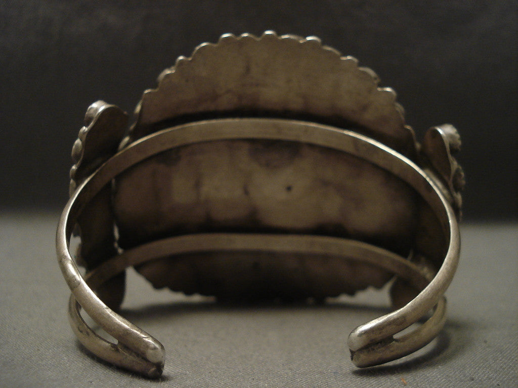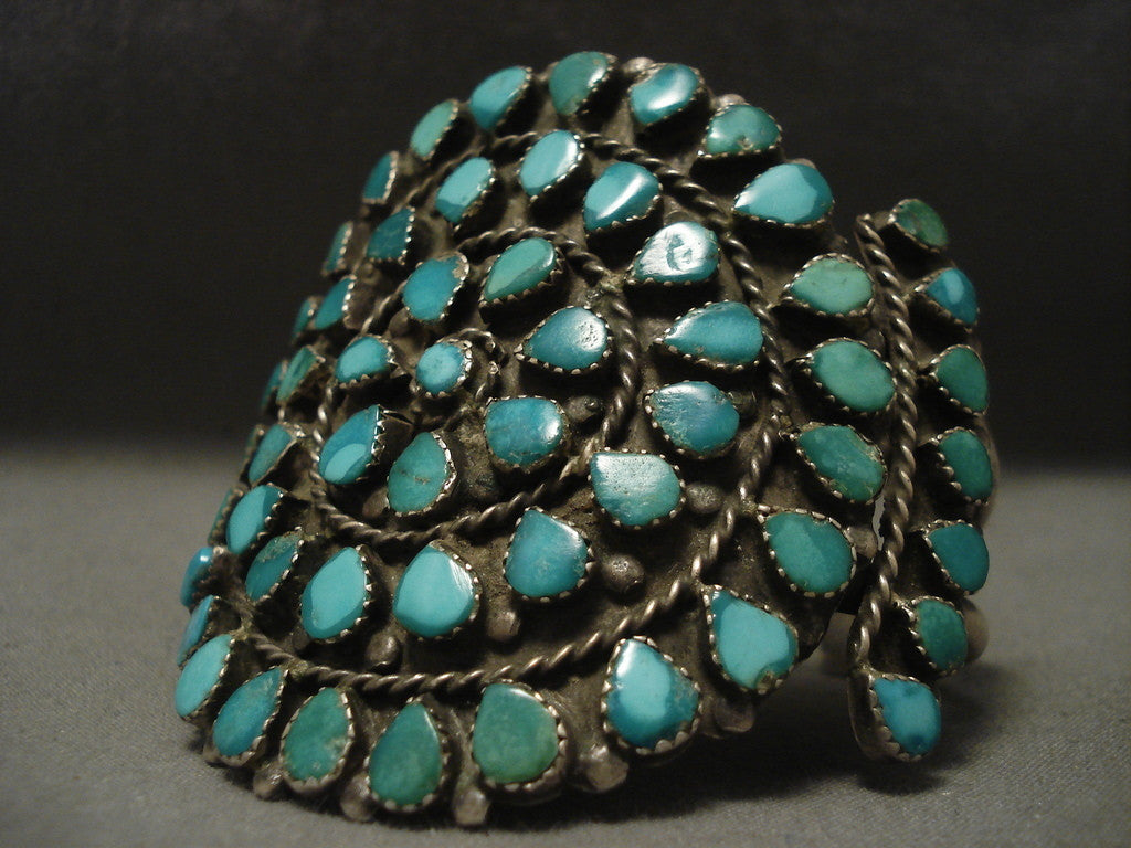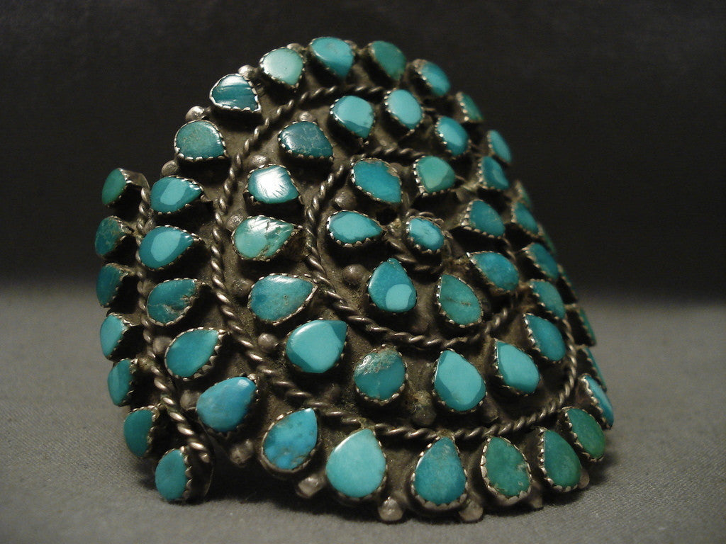 This is a superlative vintage Navajo musuem quality very old and very rare silver cluster bracelet containing green and blue absolutely amazing turquoise stones. This cuff is very wide and the silver work is phenomenal. This very old piece contains a fascinating double silver shank cuff. The width of the bracelet measures around 2-5/8". Sterling silver. Cir. 1930's+. The inside end to end measures around 5-3/4" with an additional 1" gap. Sturdy 66 grams. MAKE US AN OFFER- We like to be flexible! Send us your reasonable offer on this piece(s), you have nothing to lose. The most common email we receive is from buyers who waited too long and someone bought it before they did. LAYAWAYS- Please contact us prior to purchasing and we can work out an easy 0%-interest Paypal/ Money Order lay-a-way plan that fits your budget. (Item must be of $100 value or more).