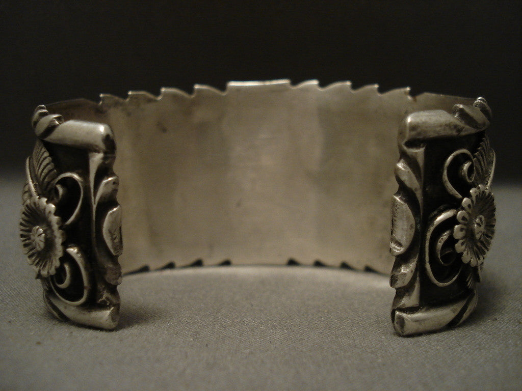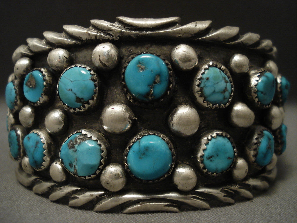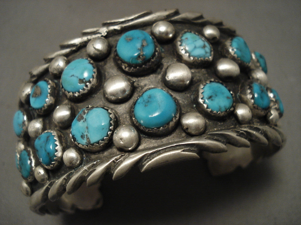 This is a magnificent vintage Navajo museum quality huge and heavy silver bracelet containing a fabulous collection of Old Kingman turquoise stones, a total of 16. Bordering the bracelet are huge silver waves. Located on each end of the piece are remarkable huge silver leaves with an accenting silver flower. Nestled between the stones are some of the largest handmade silver raindrops I have ever seen. This is a very heavy silver bracelet. The largest stone measures around 3/8" x 5/16". The width of the bracelet measures around 1-1/2". Sterling silver. The inside end to end measures around 6" with an additional 1-1/4" gap. Sturdy 82 grams. MAKE US AN OFFER- We like to be flexible! Send us your reasonable offer on this piece(s), you have nothing to lose. The most common email we receive is from buyers who waited too long and someone bought it before they did. LAYAWAYS- Please contact us prior to purchasing and we can work out an easy 0%-interest Paypal/ Money Order lay-a-way plan that fits your budget. (Item must be of $100 value or more).