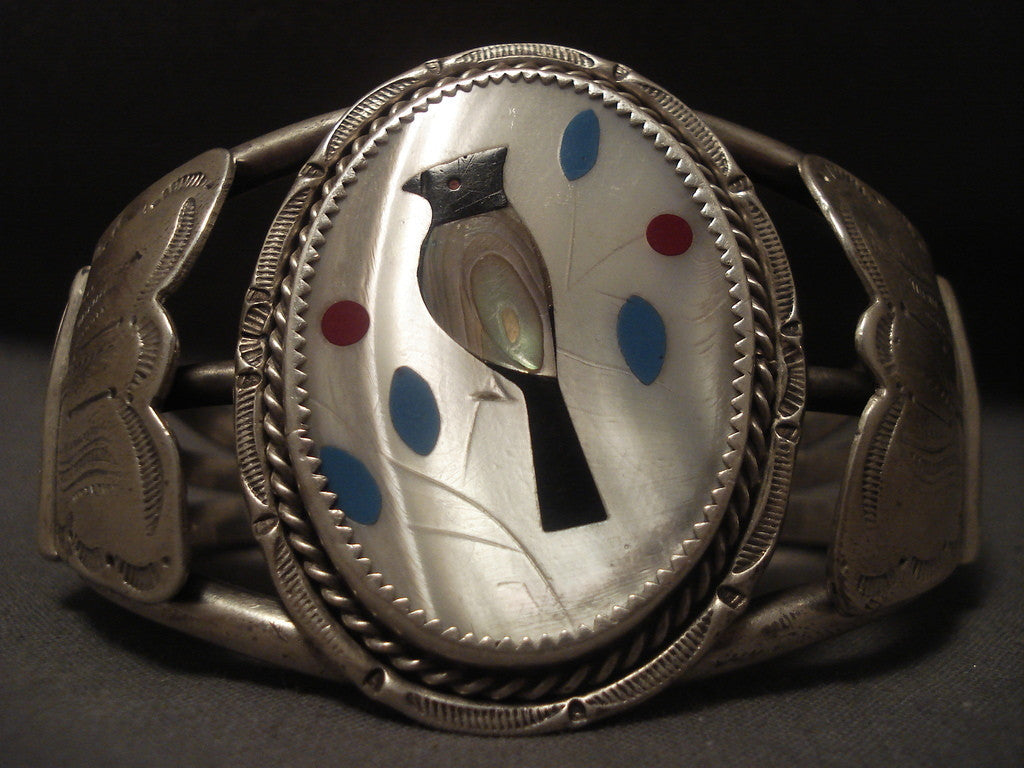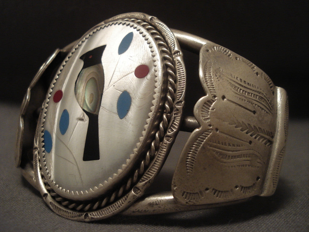 This is an impressive vintage Zuni huge silver bird bracelet. The bracelet consists of a center inlay piece that includes turquoise, coral, mother of pearl and jet. This bracelet contains two accenting hand wrought huge silver flanks. The bracelet contains a superior triple silver shank cuff that graduates in size towards the center. The center inlay piece measures around 1-1/2" X 1-1/8". The width of the bracelet measures around 1-3/4". Sterling silver. The inside end to end measures around 5-1/4" with an additional 1-1/4" gap. Sturdy 59 grams. MAKE US AN OFFER- We like to be flexible! Send us your reasonable offer on this piece(s), you have nothing to lose. The most common email we receive is from buyers who waited too long and someone bought it before they did. LAYAWAYS- Please contact us prior to purchasing and we can work out an easy 0%-interest Paypal/ Money Order lay-a-way plan that fits your budget. (Item must be of $100 value or more).