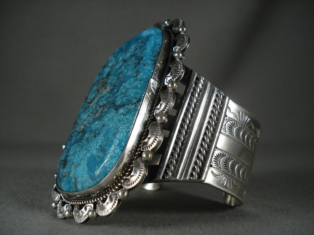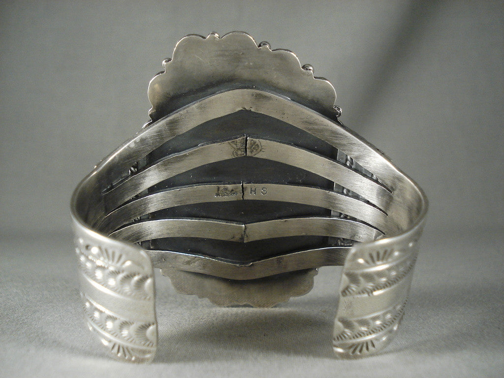 Up for sale is this magnificent vintage Navajo silver bracelet. This rounded-off big Blue Diamond turquoise stone is in the shape of a parallelogram - and I must say - its dynamic beauty is unparalleled! It's matrix and colorations are simply electric! It's surrounded with silver rope and a lofty frame of flower petal designs of arched silver applique fans and silver beads. To its sides are vertical silver stations of bars and rope, where the five split rails join up with hand stamped designs to form the 1" wide cuff to the ends. What a presence! The center stone measures around 2-1/4" x 1-3/8". The width of the bracelet measures around 3". Signed by Navajo artist, Herm Smith. Sterling silver, marked. Cir. 1990's+. The inside end to end measures around 5-3/4" with an additional 1-1/4" gap. Sturdy 110 grams. LAYAWAYS- We are happy to work with you and are more flexible than anyone on the net. Simply send us an email for more information.Make Us an Offer- Due to the high demand of our items, many pieces sell quite fast. The most frequent email we receive are from buyers who waited too long to make us an offer and suddenly lost out because another buyer came in and purchased. Send us your reasonable offer today, we are flexible and you have nothing to lose! We also have layaway available and are happy to work with you. Send us an email for more details. Ahéhee’ (Thank you)