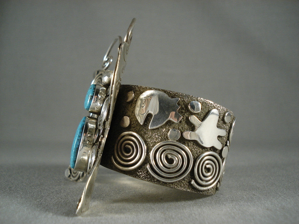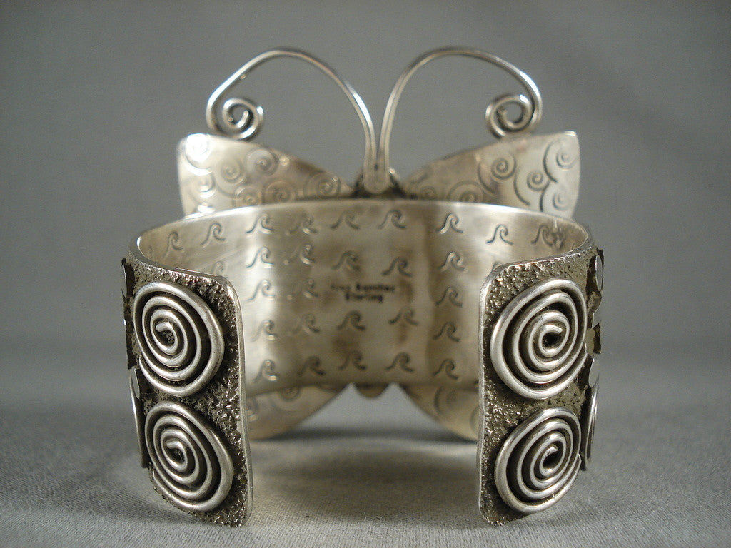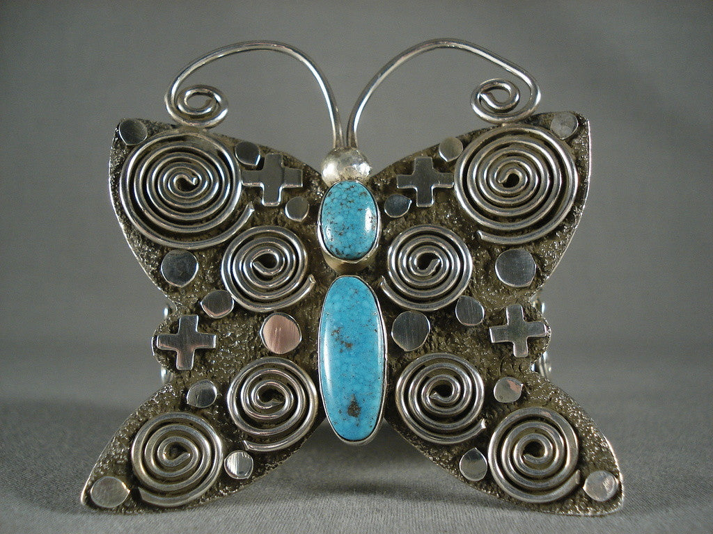 Here we have an exceptional vintage Navajo silver bracelet. This embellished realistic shaped butterfly is truly a work of art! If mother nature could use silver artforms to design butterflies - this is what they'd look like! :) The heart and soul of this beauty is electrifying Kingman turquoise! And the high polished silver patterns of crosses swirls and rounds are truly incredibly expressive shapes! In keeping with the vivid aura, the thick, 1-1/4" wide band also incorporates happy shapes of a large bear, turtle, hand and dragonfly! This bracelet just seems to emanates good energy! The largest stone measures around 7/8" x 3/8". The width of the bracelet measures around 3". Signed by Navajo artist, Alex Sanchez. Sterling silver, marked. The inside end to end measures around 5-5/8" with an additional 1" gap. Sturdy 152 grams. LAYAWAYS- We are happy to work with you and are more flexible than anyone on the net. Simply send us an email for more information.Make Us an Offer- Due to the high demand of our items, many pieces sell quite fast. The most frequent email we receive are from buyers who waited too long to make us an offer and suddenly lost out because another buyer came in and purchased. Send us your reasonable offer today, we are flexible and you have nothing to lose! We also have layaway available and are happy to work with you. Send us an email for more details. Ahéhee’ (Thank you)