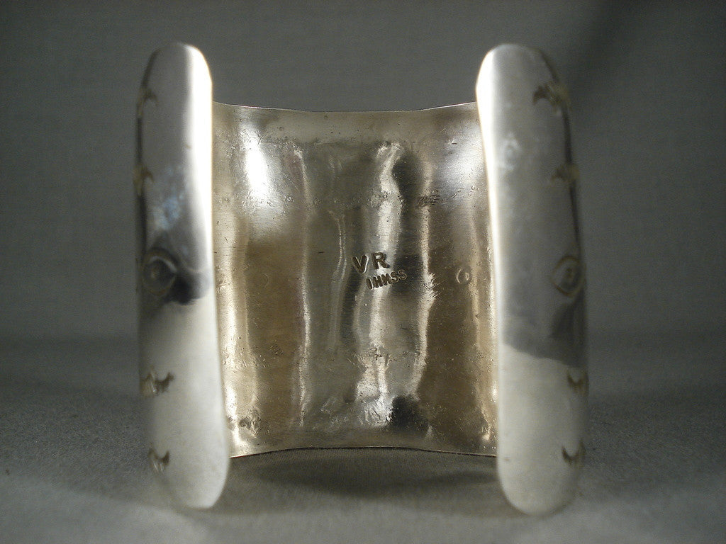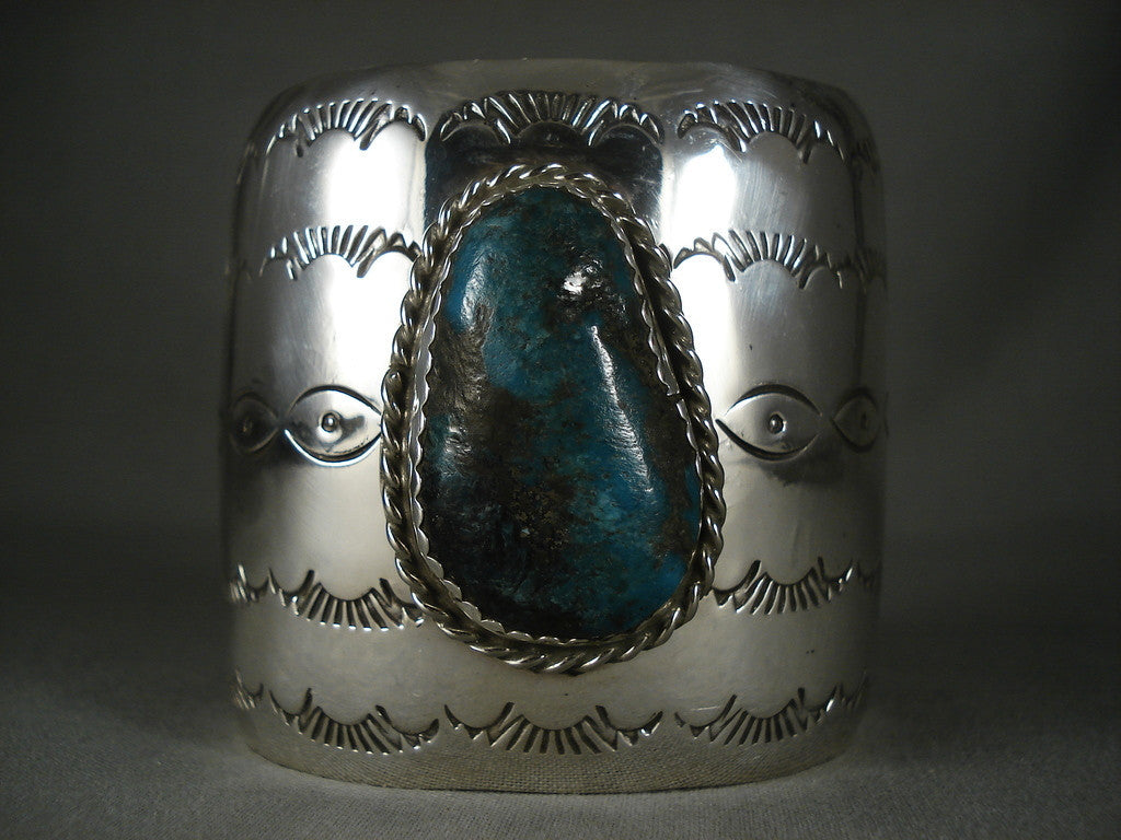 This is a superior vintage Navajo silver bracelet. This huge Pilot Mountain turquoise stone could stop traffic - as it's surrounded with thick silver rope and placed upon this wide, high-polish silver cuff! Five horizontal rows of deep hand stamped sunrises, clouds and watchful eyes decorate this slightly convex suface bracelet from end to end! The center stone measures around 1-3/8" x 3/4". The width of the bracelet measures around 2-3/8". Signed by Navajo artist, V. R.. Sterling silver, marked. Cir. 1990's+. The inside end to end measures around 6" with an additional 1-3/8" gap. Sturdy 124 grams. LAYAWAYS- We are happy to work with you and are more flexible than anyone on the net. Simply send us an email for more information.Make Us an Offer- Due to the high demand of our items, many pieces sell quite fast. The most frequent email we receive are from buyers who waited too long to make us an offer and suddenly lost out because another buyer came in and purchased. Send us your reasonable offer today, we are flexible and you have nothing to lose! We also have layaway available and are happy to work with you. Send us an email for more details. Ahéhee’ (Thank you)
