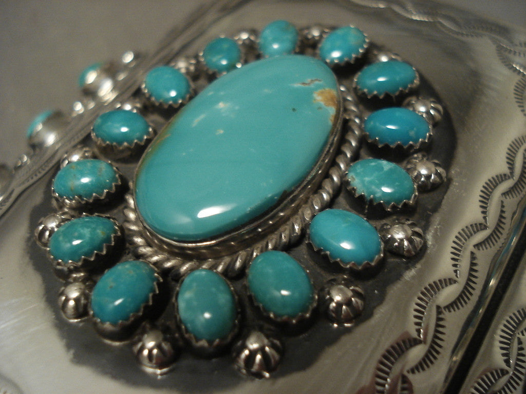 This is a remarkable modernistic Navajo museum quality silver ketoh bracelet having three impressive sterling silver segments with outstanding natural green turquoise stones in satellite formations. The silver works on this piece are stunning silver sun patterns that beautifully border the silver plates. The center plate measures around 3" X 2-1/4". Surrounding the stones are fascinating handmade silver shells. This bracelet will fit a wrist size of about 7" to 8". The center stone measures around 1-1/8" x 5/8". The width of the bracelet measures around 3". Artist Jimmie Martin . Sterling silver. Sturdy 109 grams. LAYAWAYS- We are happy to work with you and are more flexible than anyone on the net. Simply send us an email for more information.Make Us an Offer- Due to the high demand of our items, many pieces sell quite fast. The most frequent email we receive are from buyers who waited too long to make us an offer and suddenly lost out because another buyer came in and purchased. Send us your reasonable offer today, we are flexible and you have nothing to lose! We also have layaway available and are happy to work with you. Send us an email for more details. Ahéhee’ (Thank you)