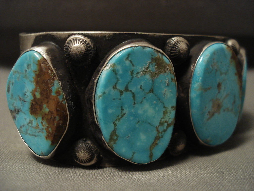 This is an astonishing vintage Navajo huge silver bracelet. This bracelet contains five remarkable spiderweb turquoise stones that appear to be Number 8. Resting throughout the stones are marvelous handmade silver shells. Located on the ends of the thick silver cuff as well as on the inside of the cuff are outstanding silver sun works with accenting yucca plants. The stones measure around 1-1/8" x 3/4". The width of the bracelet measures around 1-1/4". Signed by Navajo artist, Nel Burbank . Sterling silver, marked. Cir. 1980's+. The inside end to end measures around 5-1/2" with an additional 1-1/2" gap. Sturdy 125 grams. LAYAWAYS- We are happy to work with you and are more flexible than anyone on the net. Simply send us an email for more information.Make Us an Offer- Due to the high demand of our items, many pieces sell quite fast. The most frequent email we receive are from buyers who waited too long to make us an offer and suddenly lost out because another buyer came in and purchased. Send us your reasonable offer today, we are flexible and you have nothing to lose! We also have layaway available and are happy to work with you. Send us an email for more details. Ahéhee’ (Thank you)