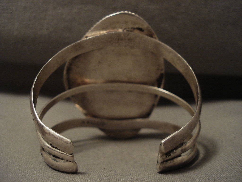 This is a tremendous vintage Navajo silver bracelet having a huge natural blue turquoise stone. Just look how large that stone is, wow! This is an older bracelet and consists of a marvelous triple silver shank cuff. Located on the outer shanks are beautiful silver sun works. Surrounding the stone is a stunning silver rope. The height of the bracelet at the center measures around 2-3/4" and the width at the center of the cuff measures around 2". The center stone measures around 2-1/2" x 1-5/8". Signed by Navajo artist, A. Willeto . Sterling silver. Cir. 1950's+. The inside end to end measures around 5-1/2" with an additional 1" gap. Sturdy 71 grams. LAYAWAYS- We are happy to work with you and are more flexible than anyone on the net. Simply send us an email for more information.Make Us an Offer- Due to the high demand of our items, many pieces sell quite fast. The most frequent email we receive are from buyers who waited too long to make us an offer and suddenly lost out because another buyer came in and purchased. Send us your reasonable offer today, we are flexible and you have nothing to lose! We also have layaway available and are happy to work with you. Send us an email for more details. Ahéhee’ (Thank you)