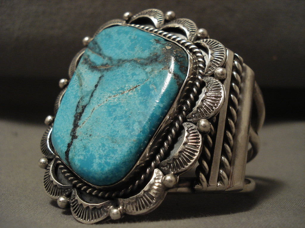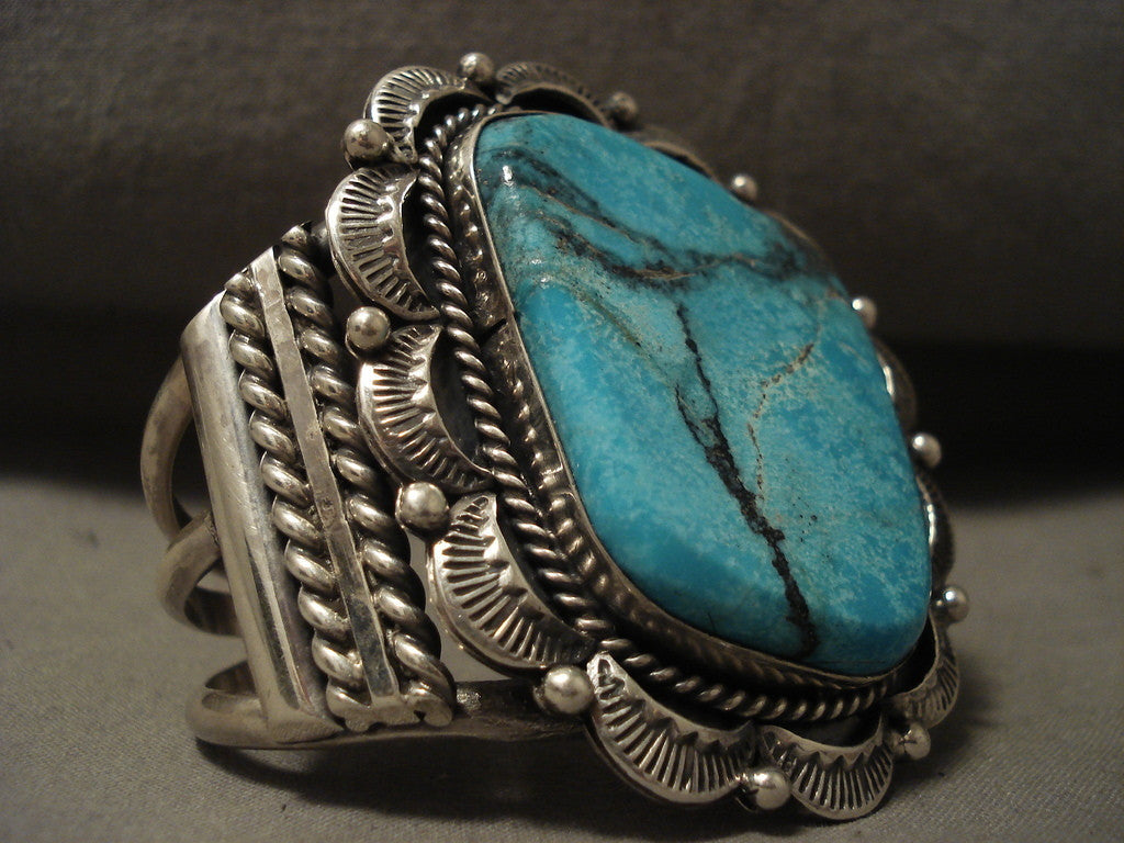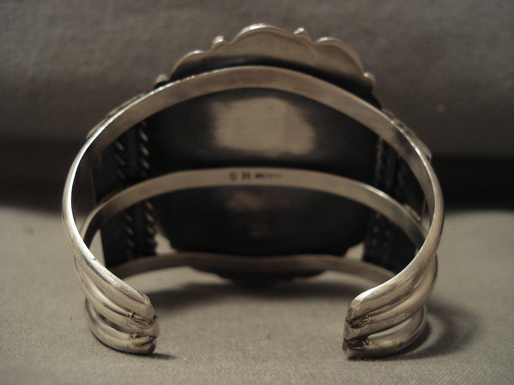 This is an exceptional vintage Navajo silver bracelet. This piece contains a huge blue spiderweb turquoise stone that appears to have originated from the Blue Diamond turquoise mine. Surrounding the stone are impeccable silver shells, lraindrops and ropes. Located on each side of the bracelet are wonderful silver flanks. This bracelet inlcudes an incredible thick and sturdy triple silver shank cuff. The center stone measures around 1-7/8" x 1-3/8". The width of the bracelet measures around 2". Signed by Navajo artist, Herm Smith . Sterling silver, marked. The inside end to end measures around 5" with an additional 1" gap. Sturdy 89 grams. LAYAWAYS- We are happy to work with you and are more flexible than anyone on the net. Simply send us an email for more information.Make Us an Offer- Due to the high demand of our items, many pieces sell quite fast. The most frequent email we receive are from buyers who waited too long to make us an offer and suddenly lost out because another buyer came in and purchased. Send us your reasonable offer today, we are flexible and you have nothing to lose! We also have layaway available and are happy to work with you. Send us an email for more details. Ahéhee’ (Thank you)