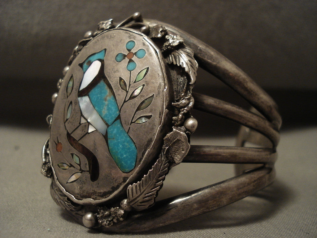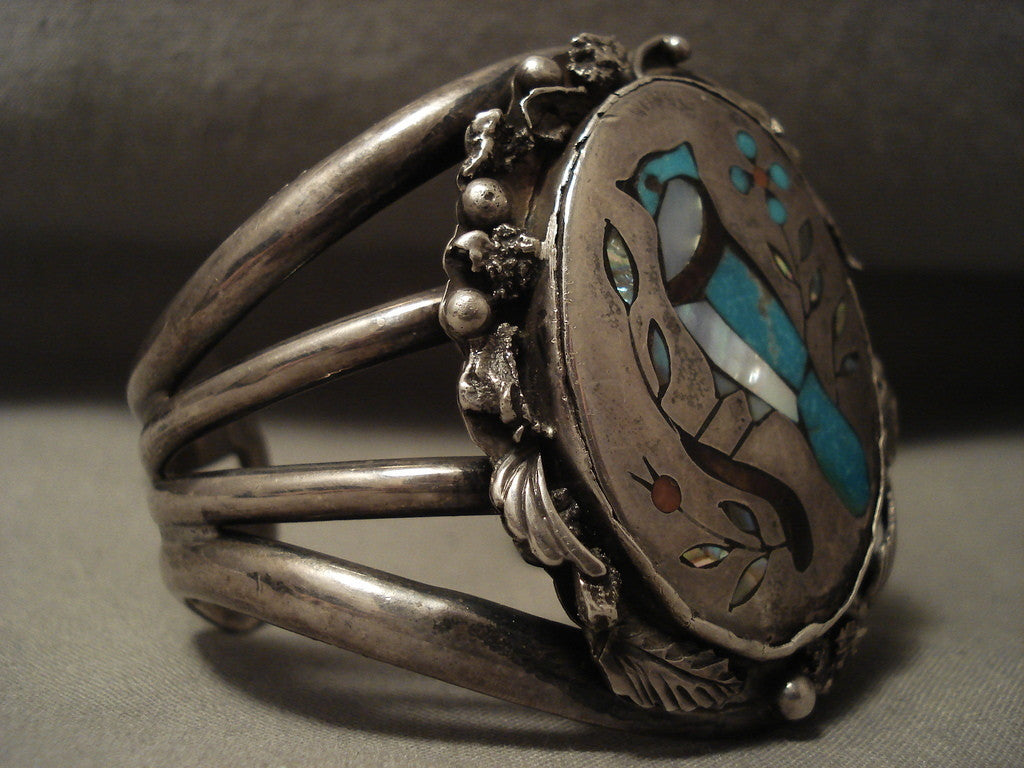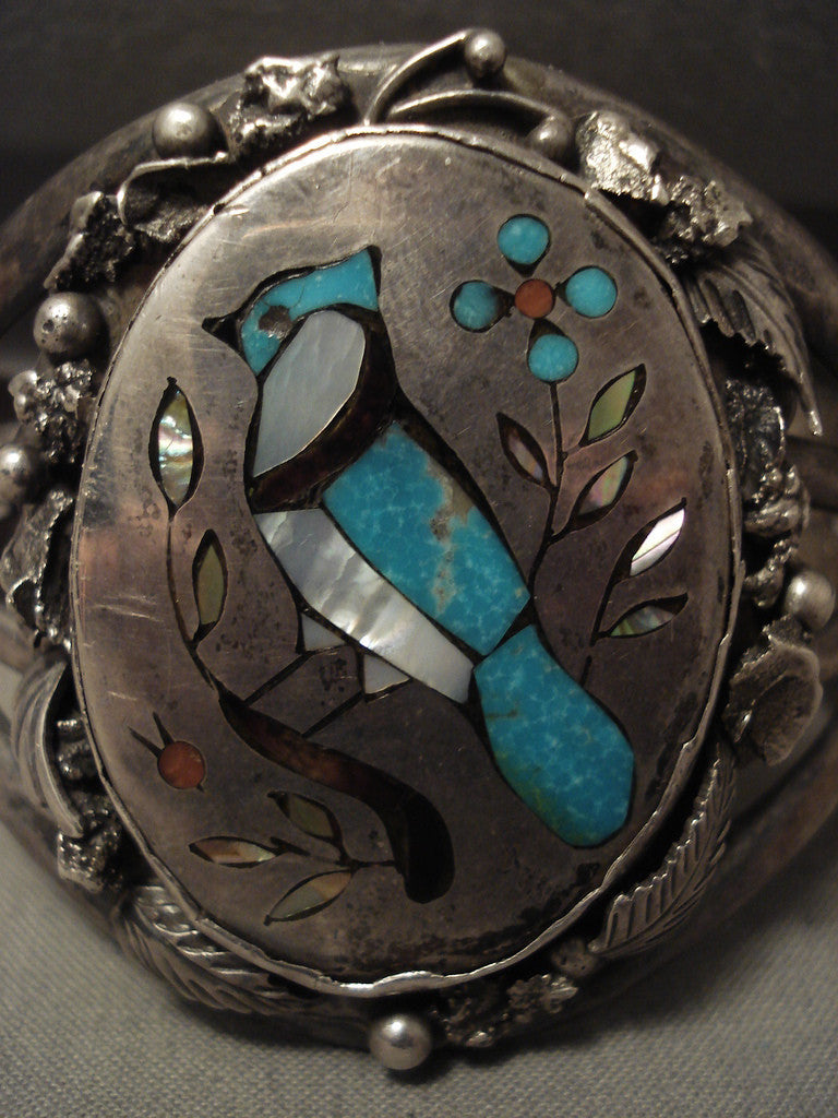 This is a marvelous vintage Zuni/ Navajo inlaid blue jay silver bracelet. This bracelet contains an absolutely incredible inlay of blue turquoise stones, abalone shell, and coral. Look at the beautiful hand carved silver leaf work that surrounds the center inlay. This bracelet consists of a wonderful heavy quadruple silver shank cuff. The width of the bracelet measures around 2". Signed by Zuni/ Navajo artist Robert Kelly . Sterling silver. Cir. 1950's+. The inside end to end measures around 5-3/4" with an additional 1" gap. Sturdy 71 grams. LAYAWAYS- We are happy to work with you and are more flexible than anyone on the net. Simply send us an email for more information.Make Us an Offer- Due to the high demand of our items, many pieces sell quite fast. The most frequent email we receive are from buyers who waited too long to make us an offer and suddenly lost out because another buyer came in and purchased. Send us your reasonable offer today, we are flexible and you have nothing to lose! We also have layaway available and are happy to work with you. Send us an email for more details. Ahéhee’ (Thank you)