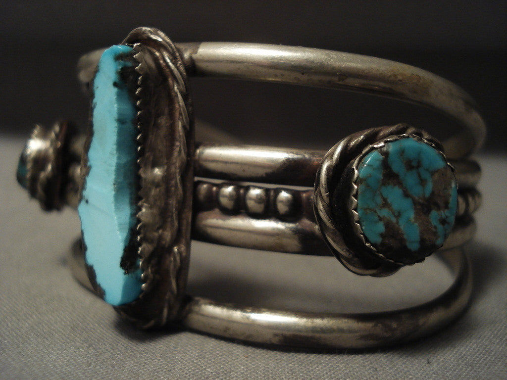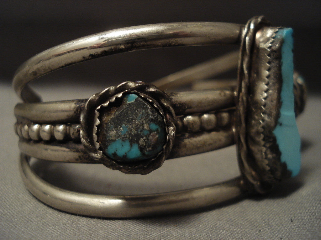 This is an incredible vintage Navajo museum quality silver bracelet having two different types of turquoise stones. The center stone is a fabulous Bisbee turquoise stone while the two accenting stones are amazing Royston turquoise. Located on this bracelet are 5 outstanding silver shanks with the center having striking handmade silver raindrops. The center stone measures around 1-1/8" x 1/4". The width of the bracelet measures around 1-1/4". Sterling silver. The inside end to end measures around 5-1/2" with an additional 1-1/4" gap. Sturdy 49 grams. LAYAWAYS- We are happy to work with you and are more flexible than anyone on the net. Simply send us an email for more information.Make Us an Offer- Due to the high demand of our items, many pieces sell quite fast. The most frequent email we receive are from buyers who waited too long to make us an offer and suddenly lost out because another buyer came in and purchased. Send us your reasonable offer today, we are flexible and you have nothing to lose! We also have layaway available and are happy to work with you. Send us an email for more details. Ahéhee’ (Thank you)