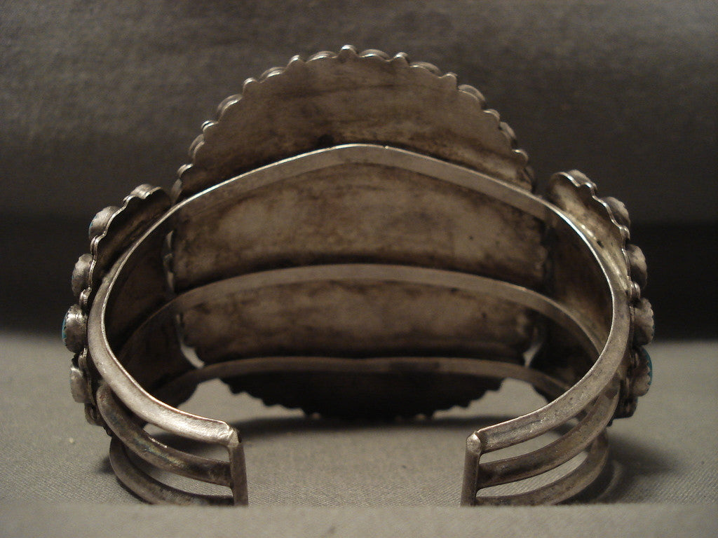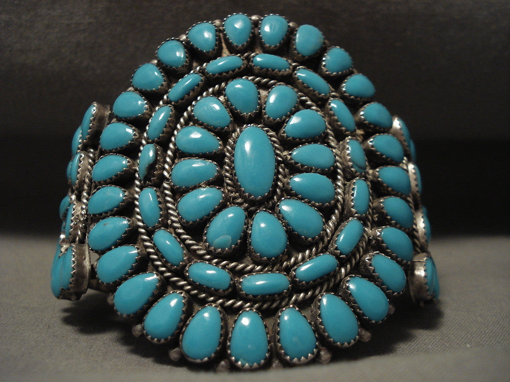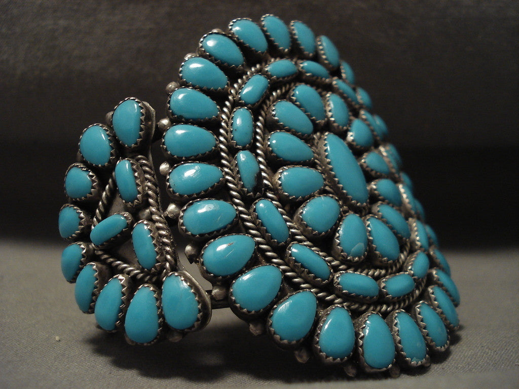 This is a magnificent vintage Navajo huge cluster silver bracelet. Resting on this piece are remarkable huge teardrop shaped blue turquoise stones. Surrounding the clusters are wonderful silver ropes and beads. This bracelet includes a superior triple silver shank cuff. The center stone measures around 1/2" x 1/4". The width of the bracelet measures around 1-3/4". Sterling silver. The inside end to end measures around 6" with an additional 1" gap. Sturdy 80 grams. LAYAWAYS- We are happy to work with you and are more flexible than anyone on the net. Simply send us an email for more information.Make Us an Offer- Due to the high demand of our items, many pieces sell quite fast. The most frequent email we receive are from buyers who waited too long to make us an offer and suddenly lost out because another buyer came in and purchased. Send us your reasonable offer today, we are flexible and you have nothing to lose! We also have layaway available and are happy to work with you. Send us an email for more details. Ahéhee’ (Thank you)