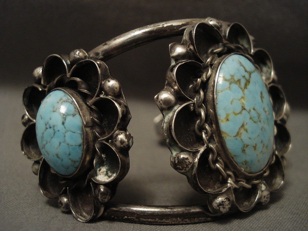 This is an incredible vintage Navajo silver bracelet having three very rare dome shaped Number 8 turquoise stones. Surrounding the stones are amazing silver swirls, ropes and raindrops. Check out that patina, absolutely marvelous. The bracelet consists of a wonderful double silver shank cuff. The center stone measures around 1" x 3/4". The width of the bracelet measures around 1-5/8". Sterling silver. Cir. Mid century . The inside end to end measures around 5-1/2" with an additional 1" gap. Sturdy 50 grams. LAYAWAYS- We are happy to work with you and are more flexible than anyone on the net. Simply send us an email for more information.Make Us an Offer- Due to the high demand of our items, many pieces sell quite fast. The most frequent email we receive are from buyers who waited too long to make us an offer and suddenly lost out because another buyer came in and purchased. Send us your reasonable offer today, we are flexible and you have nothing to lose! We also have layaway available and are happy to work with you. Send us an email for more details. Ahéhee’ (Thank you)