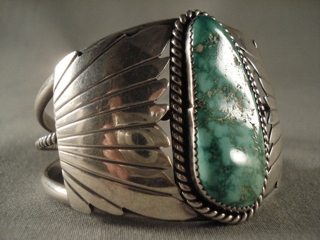 An astounding vintage Navajo silver bracelet. One long vibrant green Spiderweb turquoise stone is surrounded with thick silver rope as its placed upon this triple silver rail cuff. Large hand carved silver fan appliques flank either side. The center rail as silver rope also adds a special touch. The center stone measures around 1-1/2" x 5/8". The width of the bracelet measures around 1-3/4". Signed by Navajo artist, Joe Bahe. Sterling silver, marked. Cir. 1990's+. The inside end to end measures around 5-1/2" with an additional 1-1/4" gap. Sturdy 44 grams. MAKE US AN OFFER- We like to be flexible! Send us your reasonable offer on this piece(s), you have nothing to lose. The most common email we receive is from buyers who waited too long and someone bought it before they did. LAYAWAYS- Please contact us prior to purchasing and we can work out an easy 0%-interest Paypal/ Money Order lay-a-way plan that fits your budget. (Item must be of $100 value or more).