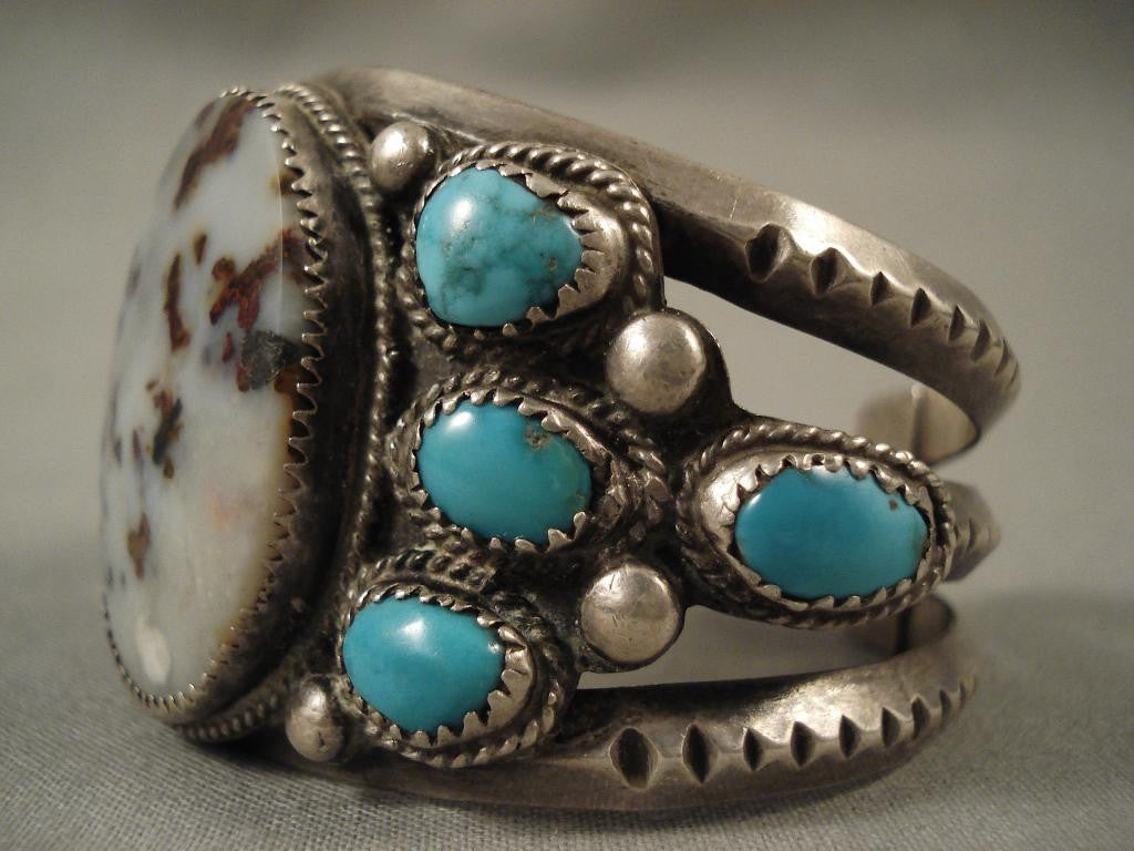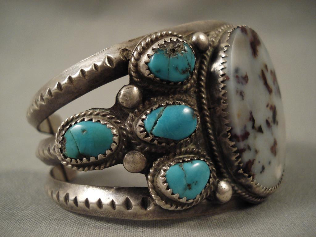 This is a magnificent vintage Navajo silver bracelet. One large oval jasper stone is surrounded with silver rope and placed at the heart of this hand carved silver triple rail cuff. Four turquoise stones and silver beads accent and flank either side. The center stone measures around 1-3/8" x 1". The width of the bracelet measures around 1-1/2". Signed by Navajo artist, Jay Spencer. Sterling silver. Cir. 1970's+. The inside end to end measures around 5-1/2" with an additional 1" gap. Sturdy 66 grams. MAKE US AN OFFER- We like to be flexible! Send us your reasonable offer on this piece(s), you have nothing to lose. The most common email we receive is from buyers who waited too long and someone bought it before they did. LAYAWAYS- Please contact us prior to purchasing and we can work out an easy 0%-interest Paypal/ Money Order lay-a-way plan that fits your budget. (Item must be of $100 value or more).