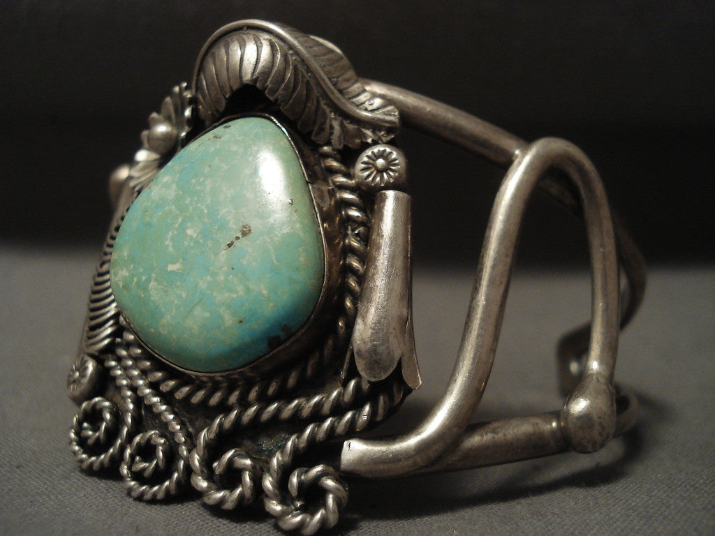 This is a marvelous vintage Navajo gallery worthy one stone silver bracelet. This bracelet carries a phenomenal Cerrillos turquoise stone. Surrounding the stone are amazing silver works that include leaves, flowers, twisted stems, flowers, shells and coils. Located on both sides of the bracelet are two silver snakes that appear to be slithering throught the phenomenal silver garden. The bracelet contains a wonderful double silver shank cuff. The turquoise stone appears to be a very old Hachita turquoise and is from the earlier deposit. The center stone measures around 1" x 7/8". The width of the bracelet measures around 1-5/8". Signed by Navajo artist, Herb Pino . Sterling silver, marked. Cir. 1950's+. The inside end to end measures around 5-1/4" with an additional 1-1/2" gap. Sturdy 48 grams. LAYAWAYS- We are happy to work with you and are more flexible than anyone on the net. Simply send us an email for more information.Make Us an Offer- Due to the high demand of our items, many pieces sell quite fast. The most frequent email we receive are from buyers who waited too long to make us an offer and suddenly lost out because another buyer came in and purchased. Send us your reasonable offer today, we are flexible and you have nothing to lose! We also have layaway available and are happy to work with you. Send us an email for more details. Ahéhee’ (Thank you)