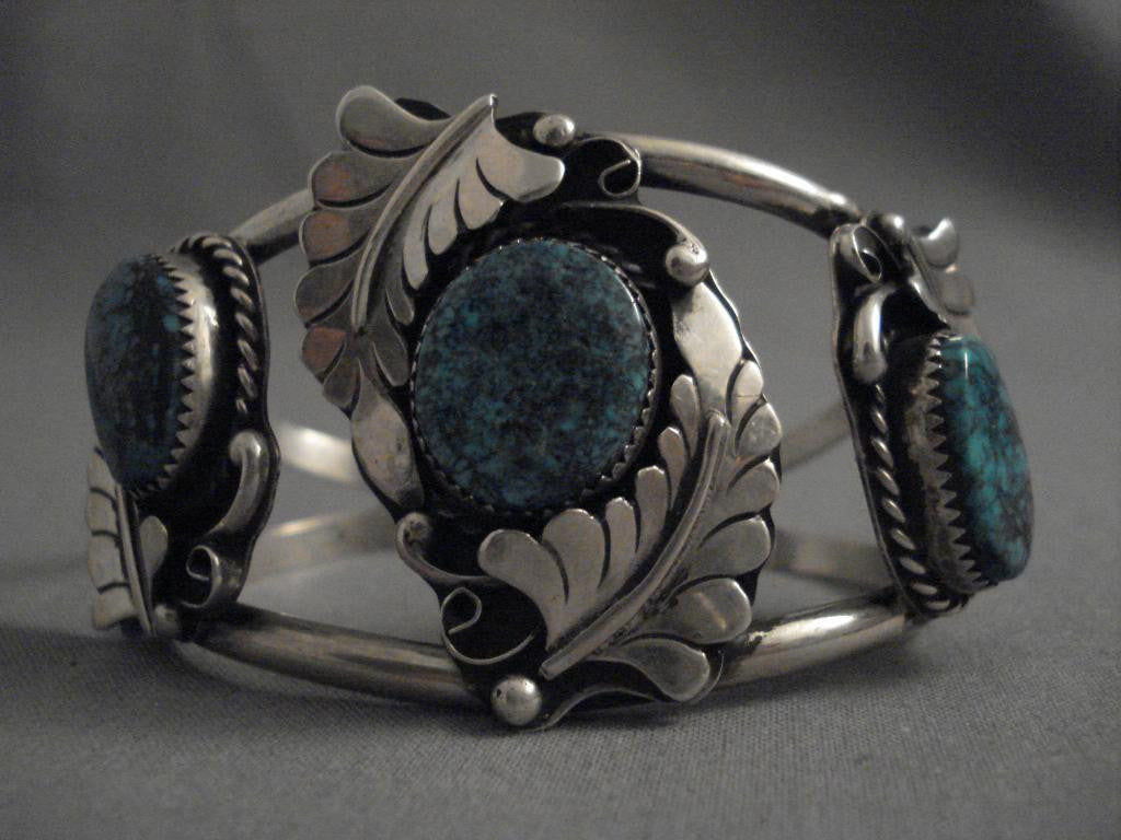 A wonderful vintage Navajo silver bracelet. The three large Pilot Mountain spiderweb Turquoise are nestled in hand wrought silver leaves on a heavy double silver cuff. The center stone measures around 3/4" x 1/2". The width of the bracelet measures around 1-3/4". Signed by Navajo artist, Ervin Nez. Sterling silver, marked. Cir. 1980's+. The inside end to end measures around 5-1/2" with an additional 1" gap. Sturdy 52 grams. MAKE US AN OFFER- We like to be flexible! Send us your reasonable offer on this piece(s), you have nothing to lose. The most common email we receive is from buyers who waited too long and someone bought it before they did. LAYAWAYS- Please contact us prior to purchasing and we can work out an easy 0%-interest Paypal/ Money Order lay-a-way plan that fits your budget. (Item must be of $100 value or more).