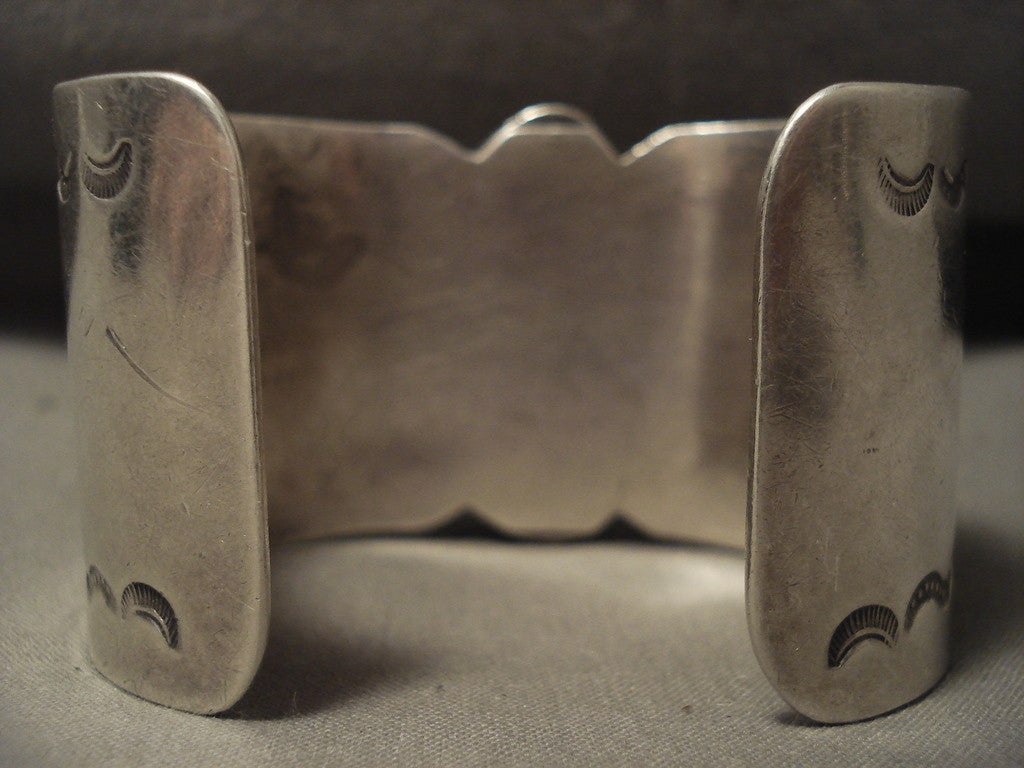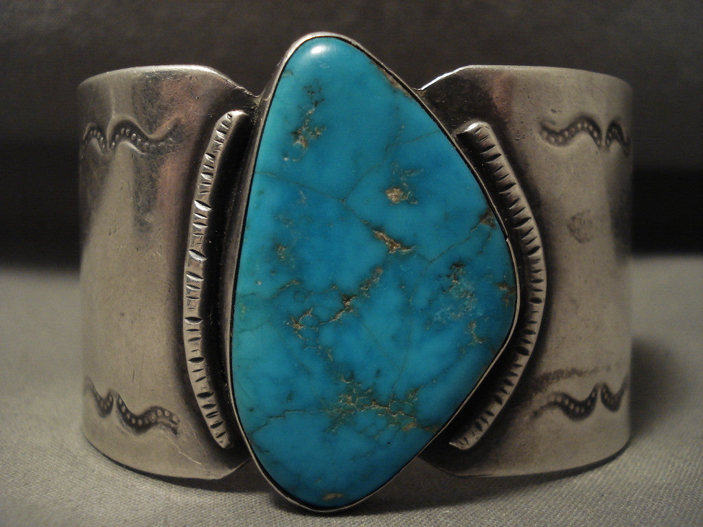 This is a magnificent vintage Navajo very wide and huge silver bracelet. This piece contains a wide and old turquoise stone that appears to have originated from the old Blue Gem turquoise mine. Located down both ends of the cuff are beautiful silver swirling patterns. The center stone measures around 1-5/8" x 1". The width of the bracelet measures around 1-1/2". Sterling silver. Cir. Mid century . The inside end to end measures around 5-3/4" with an additional 1" gap. Sturdy 94 grams. LAYAWAYS- We are happy to work with you and are more flexible than anyone on the net. Simply send us an email for more information.Make Us an Offer- Due to the high demand of our items, many pieces sell quite fast. The most frequent email we receive are from buyers who waited too long to make us an offer and suddenly lost out because another buyer came in and purchased. Send us your reasonable offer today, we are flexible and you have nothing to lose! We also have layaway available and are happy to work with you. Send us an email for more details. Ahéhee’ (Thank you)