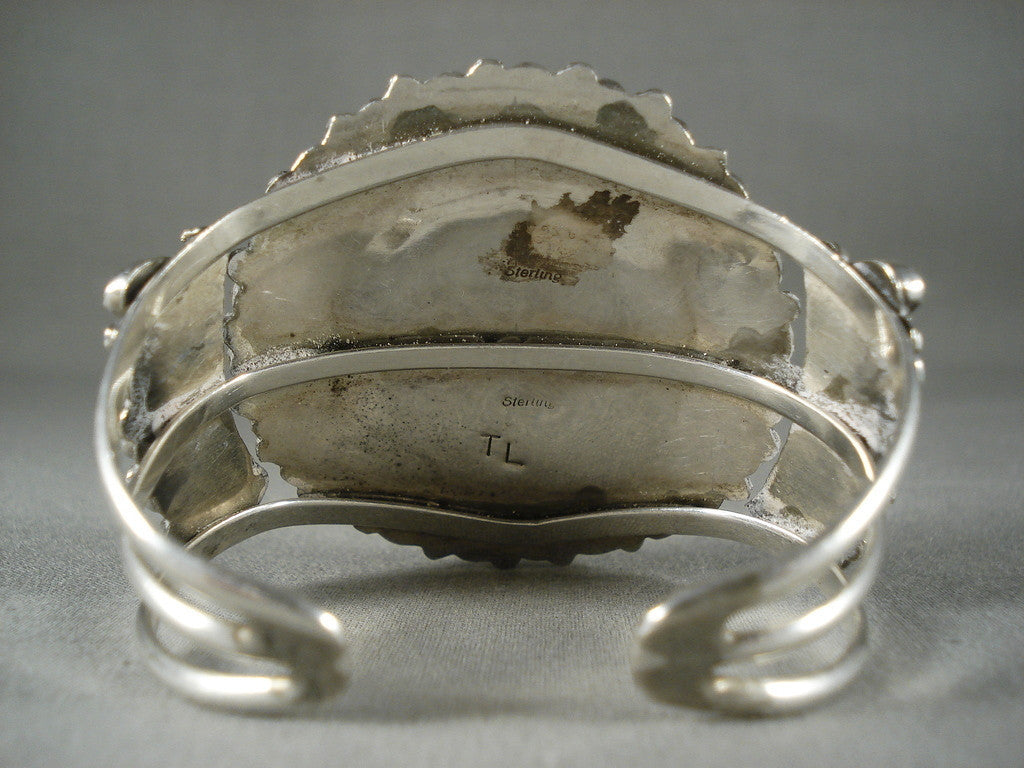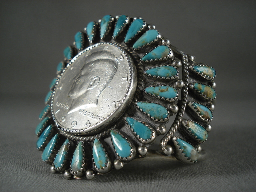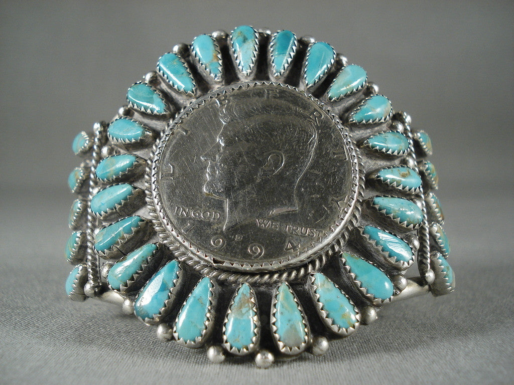 Here we have an exceptional vintage Zuni silver bracelet. The center is home to a 1994 Kennedy half dollar, as thirty- three teardrop shaped Royston turquoise stones cluster around, all pointing toward the coin, as silver rope and silver beads both separate and accent this incredible triple rail cuff. The stones measure around 3/8" x 1/8". The width of the bracelet measures around 2-1/4". Signed by Zuni artist, Terry Leonard. Sterling silver, marked. Cir. 1990's+. The inside end to end measures around 5-5/8" with an additional 1-1/8" gap. Sturdy 58 grams. LAYAWAYS- We are happy to work with you and are more flexible than anyone on the net. Simply send us an email for more information.Make Us an Offer- Due to the high demand of our items, many pieces sell quite fast. The most frequent email we receive are from buyers who waited too long to make us an offer and suddenly lost out because another buyer came in and purchased. Send us your reasonable offer today, we are flexible and you have nothing to lose! We also have layaway available and are happy to work with you. Send us an email for more details. Ahéhee’ (Thank you)