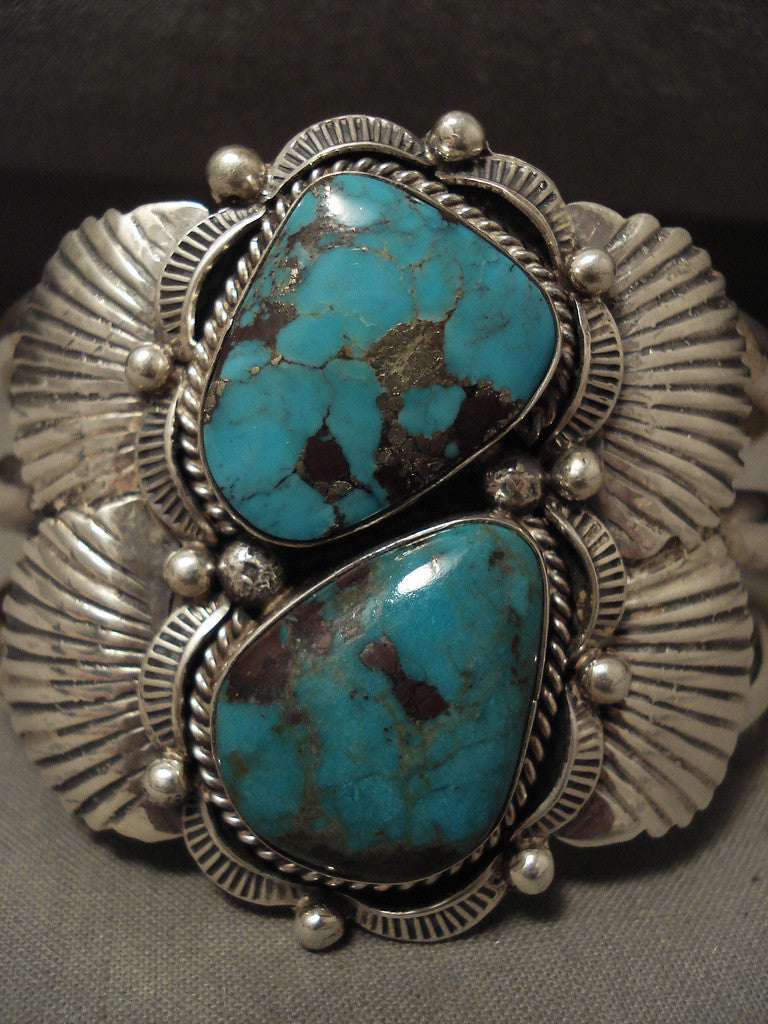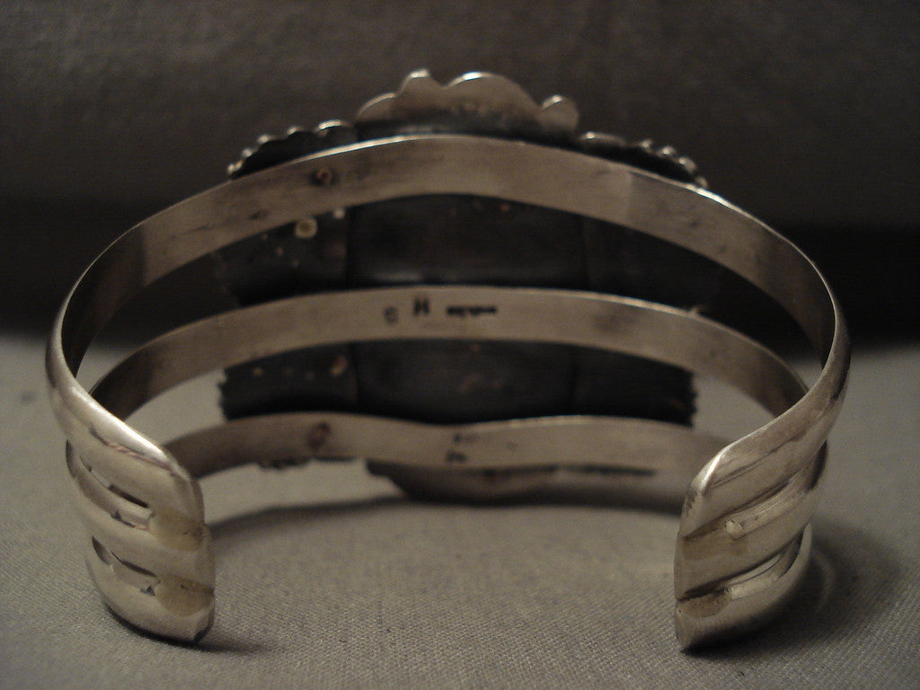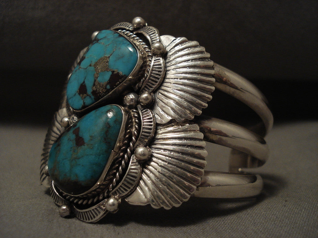 This is a breathtaking vintage Navajo silver bracelet. This museum quality silver bracelet contains two huge spiderweb turquoise stones. Located on the bracelet accenting the stones are beautiful sun bursting silver flanks with accenting silver raindrops. This bracelet consists of a wonderful triple silver shank cuff. The stones measure around 7/8" x 3/4". The width of the bracelet measures around 1-1/2". Signed by Navajo artist, Herm Smith . Sterling silver, marked. The inside end to end measures around 5-1/4" with an additional 1-1/4" gap. Sturdy 65 grams. LAYAWAYS- We are happy to work with you and are more flexible than anyone on the net. Simply send us an email for more information.Make Us an Offer- Due to the high demand of our items, many pieces sell quite fast. The most frequent email we receive are from buyers who waited too long to make us an offer and suddenly lost out because another buyer came in and purchased. Send us your reasonable offer today, we are flexible and you have nothing to lose! We also have layaway available and are happy to work with you. Send us an email for more details. Ahéhee’ (Thank you)