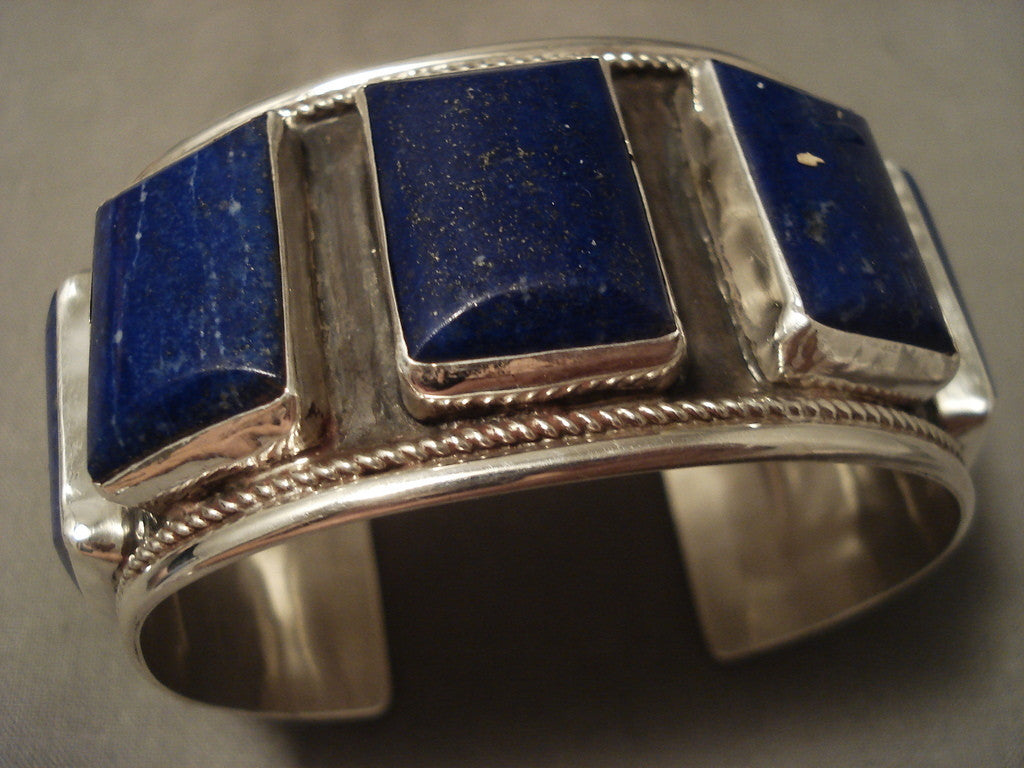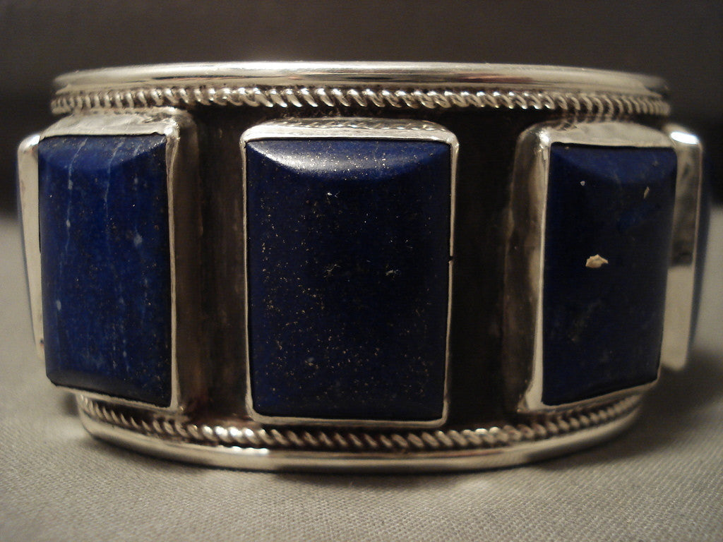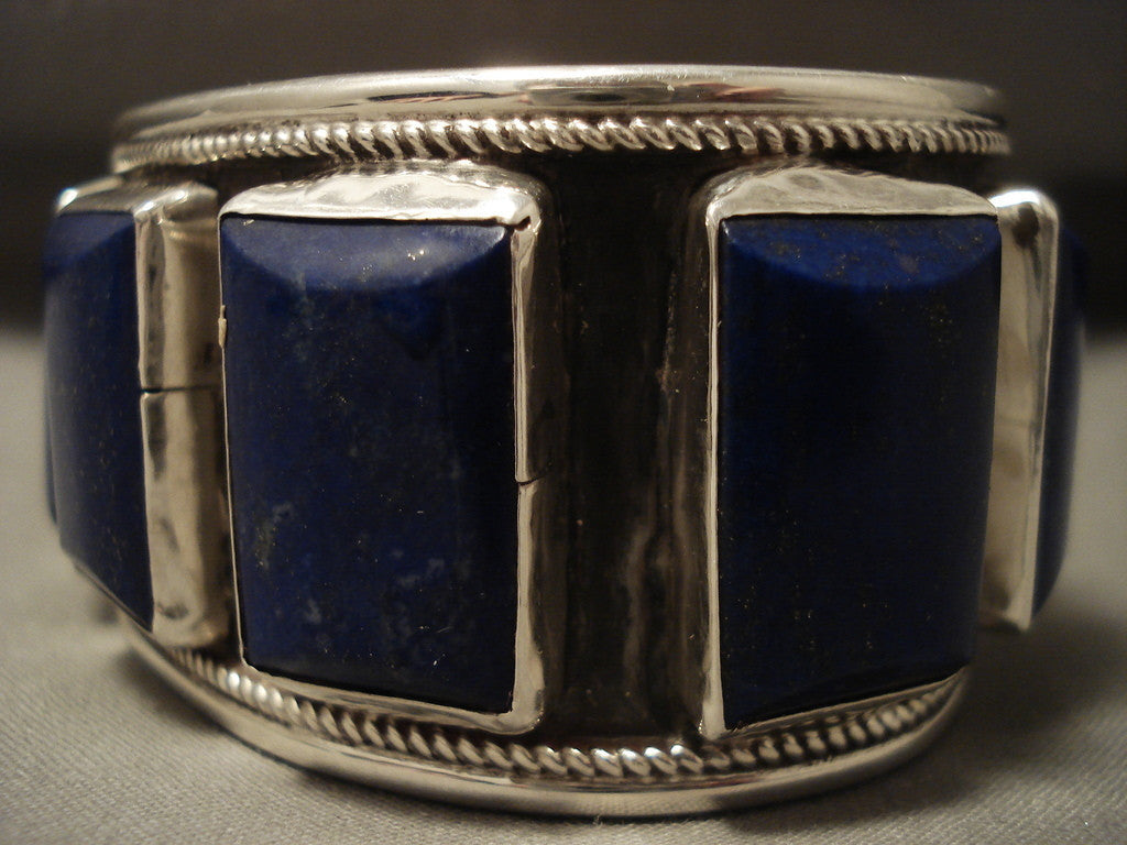 This is a museum quality vintage Navajo colossal silver bracelet. This piece contains 7 tremendous lapis stones. This bracelet is incredibly heavy. Silver ropes wonderfully bordering the edges of the cuff. The stones measure around 7/8" x 5/8". The width of the bracelet measures around 1-3/8". Signed by Navajo artist, Danny Martinez. Sterling silver, marked. Cir. 1970's+. The inside end to end measures around 5-3/4" with an additional 1-1/4" gap. Sturdy 82 grams. LAYAWAYS- We are happy to work with you and are more flexible than anyone on the net. Simply send us an email for more information.Make Us an Offer- Due to the high demand of our items, many pieces sell quite fast. The most frequent email we receive are from buyers who waited too long to make us an offer and suddenly lost out because another buyer came in and purchased. Send us your reasonable offer today, we are flexible and you have nothing to lose! We also have layaway available and are happy to work with you. Send us an email for more details. Ahéhee’ (Thank you)
