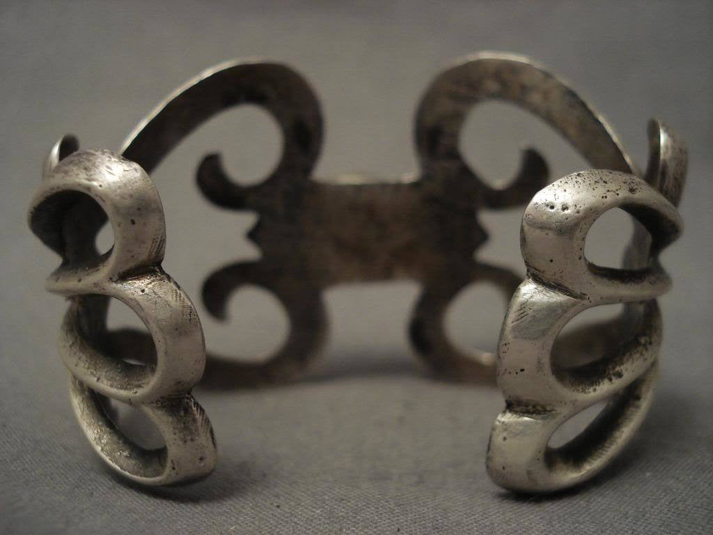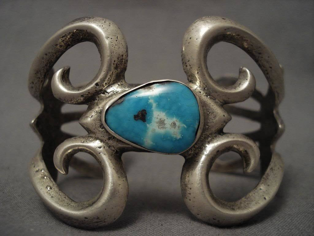 This is a museum quality vintage Navajo older cast silver bracelet having a large center high grade natural Bisbee turquoise stone. The stone is wonderfully flanked by hand casted silver thorns. The cuff is very wide and sturdy. The width at the widest point of the amazing bracelet measures abour 1-3/4". The center stone measures around 3/4" x 1/2". Sterling silver. Cir. 1940's+. The inside end to end measures around 5-1/4" with an additional 3/4" gap. Sturdy 64 grams. MAKE US AN OFFER- We like to be flexible! Send us your reasonable offer on this piece(s), you have nothing to lose. The most common email we receive is from buyers who waited too long and someone bought it before they did. LAYAWAYS- Please contact us prior to purchasing and we can work out an easy 0%-interest Paypal/ Money Order lay-a-way plan that fits your budget. (Item must be of $100 value or more).