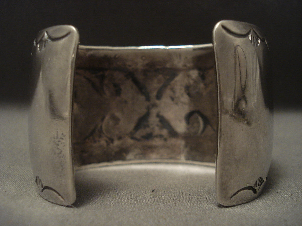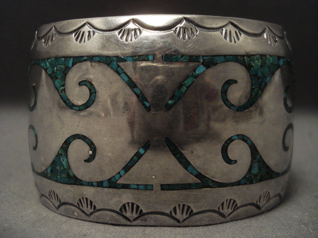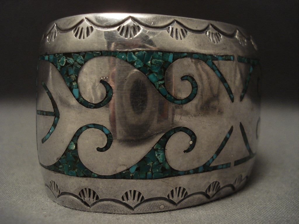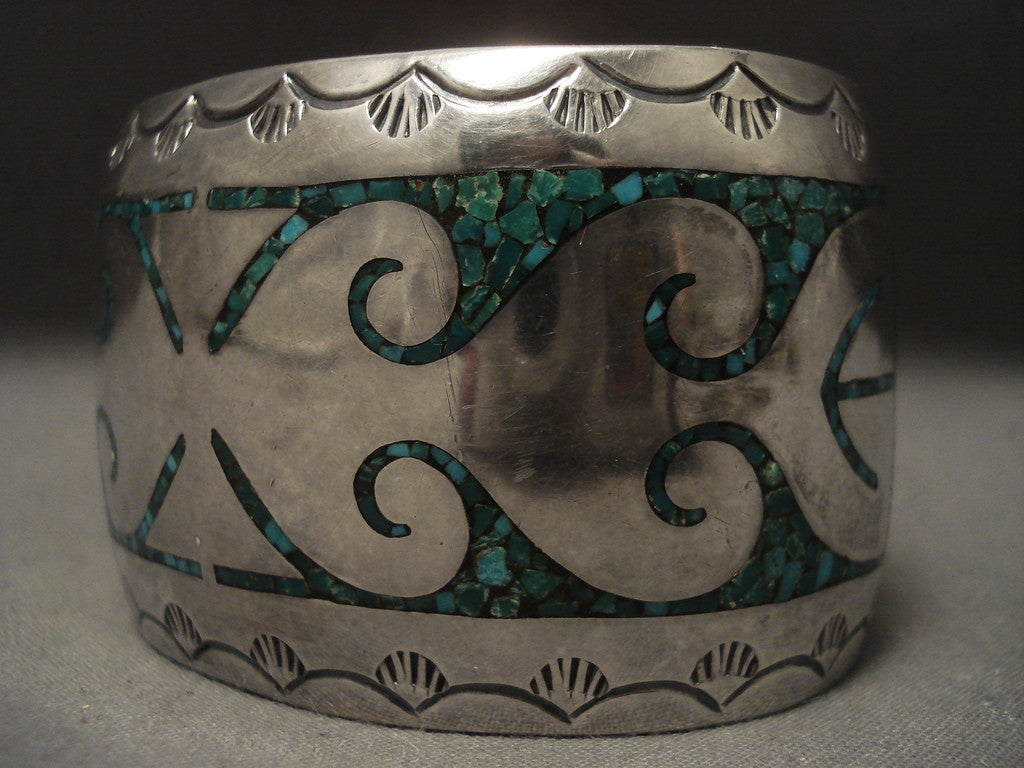 This is a remarkable vintage Navajo museum quality early 1960's hand wrought silver bracelet handmade by the famous Singer family. What makes this piece even more unique is that it is one of the heaviest and biggest pieces we have seen by the Singer family of this time period. Located on the bracelet are intricately inlaid green turquoise waves with beautiful bordering silver sun patterns. The width of the bracelet measures around 1-5/8". Artist Singer Family . Sterling silver. Cir. 1960's+. The inside end to end measures around 6" with an additional 1-1/4" gap. Sturdy 93 grams. MAKE US AN OFFER- We like to be flexible! Send us your reasonable offer on this piece(s), you have nothing to lose. The most common email we receive is from buyers who waited too long and someone bought it before they did. LAYAWAYS- Please contact us prior to purchasing and we can work out an easy 0%-interest Paypal/ Money Order lay-a-way plan that fits your budget. (Item must be of $100 value or more).