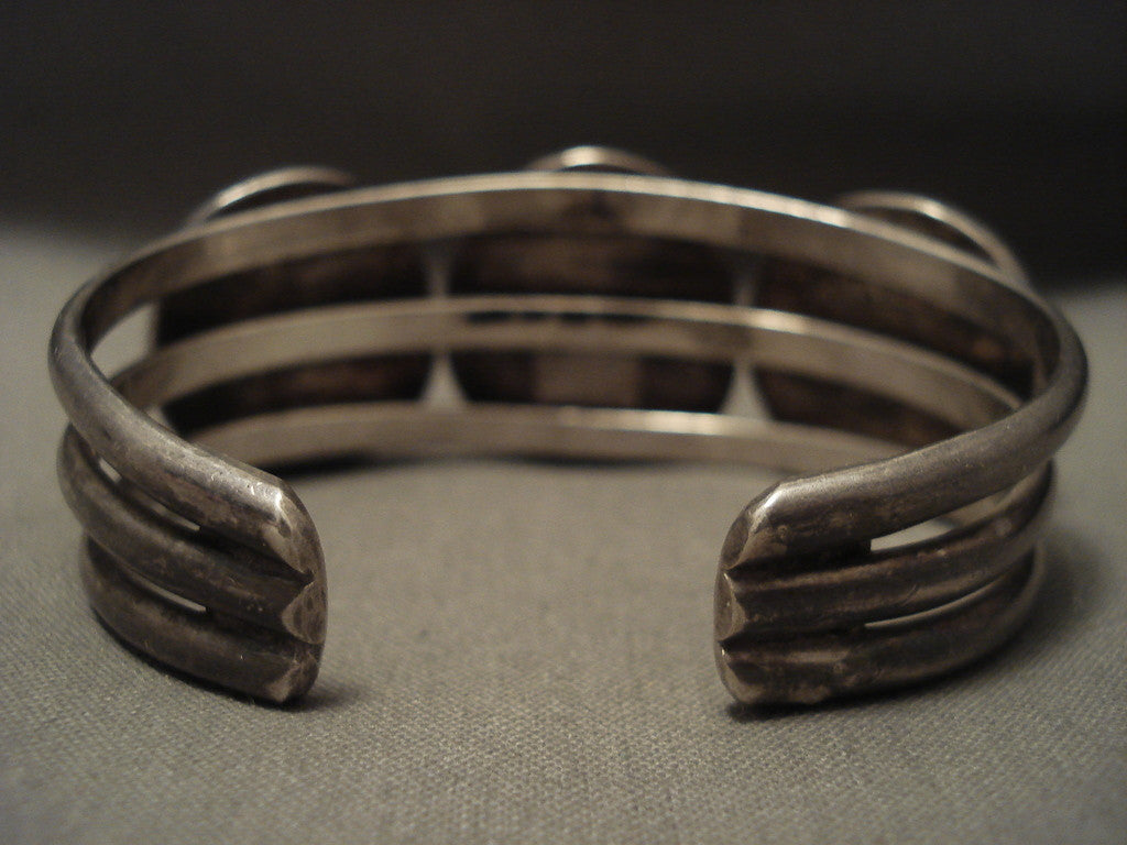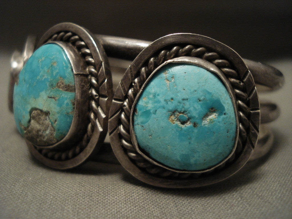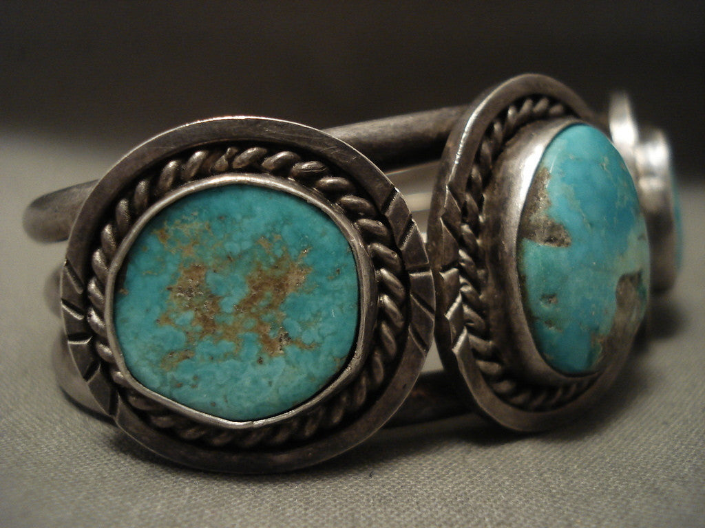 This is a stunning Navajo silver bracelet. This piece contains three huge Blue Gem turquoise stones with surrounding silver ropes. This bracelet includes a wonderful triple silver shank cuff. The center stone measures around 3/4" x 3/4". The width of the bracelet measures around 1". Signed by Navajo artist, Linda Lucas . Sterling silver. Cir. 1960's+. The inside end to end measures around 5-3/4" with an additional 3/4" gap. Sturdy 57 grams. LAYAWAYS- We are happy to work with you and are more flexible than anyone on the net. Simply send us an email for more information.Make Us an Offer- Due to the high demand of our items, many pieces sell quite fast. The most frequent email we receive are from buyers who waited too long to make us an offer and suddenly lost out because another buyer came in and purchased. Send us your reasonable offer today, we are flexible and you have nothing to lose! We also have layaway available and are happy to work with you. Send us an email for more details. Ahéhee’ (Thank you)