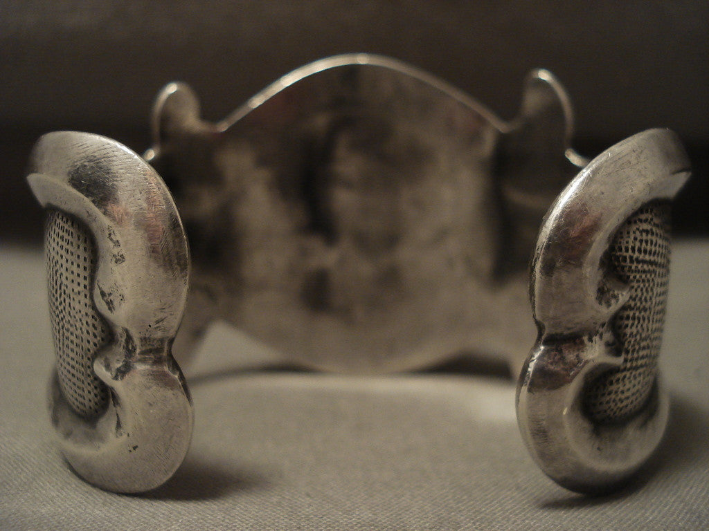 This is a breathtaking vintage Navajo museum quality very old silver bracelet. This piece contains a fabulous natural Royston turquoise stone. Surrounding the stone are advanced silver works that include large silver beads, thorn patterns and amazing dotted chisel patterns. The center stone measures around 1-3/8" x 3/4". The width of the bracelet measures around 1-3/4". Sterling silver. The inside end to end measures around 5-1/2" with an additional 1" gap. Sturdy 73 grams. LAYAWAYS- We are happy to work with you and are more flexible than anyone on the net. Simply send us an email for more information.Make Us an Offer- Due to the high demand of our items, many pieces sell quite fast. The most frequent email we receive are from buyers who waited too long to make us an offer and suddenly lost out because another buyer came in and purchased. Send us your reasonable offer today, we are flexible and you have nothing to lose! We also have layaway available and are happy to work with you. Send us an email for more details. Ahéhee’ (Thank you)