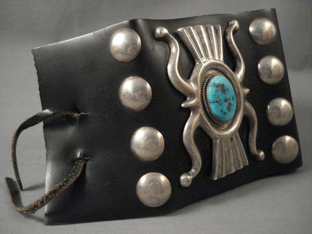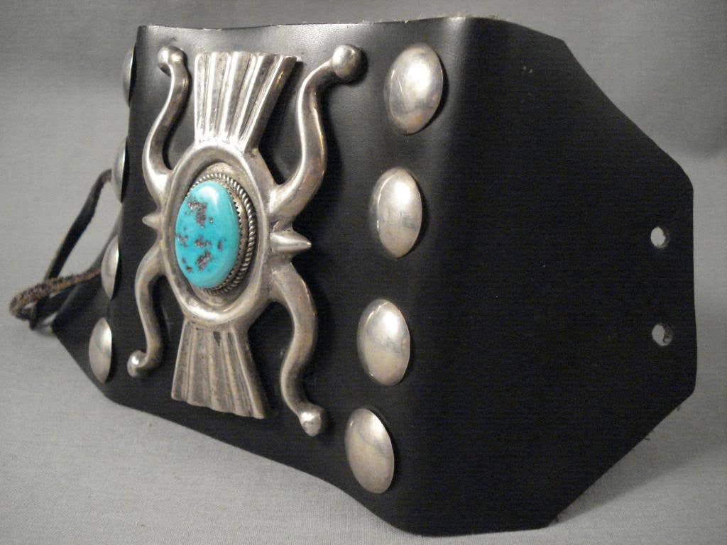A marvelous vintage Navajo silver bowguard. This leather bowguard has a 3-1/2" cast silver center ornament with a large oval Old Kingman turquoise stone at the center. It's then flanked by two sets of 3/4" round silver beads on either side. The width of the bowguard measures about 4". The center stone measures around 15/16" x 11/16". Signed by Navajo artist, Ron Long. Sterling silver. Cir. 1970's+. The inside end to end measures around 8". Sturdy 114 grams. MAKE US AN OFFER- We like to be flexible! Send us your reasonable offer on this piece(s), you have nothing to lose. The most common email we receive is from buyers who waited too long and someone bought it before they did. LAYAWAYS- Please contact us prior to purchasing and we can work out an easy 0%-interest Paypal/ Money Order lay-a-way plan that fits your budget. (Item must be of $100 value or more).
