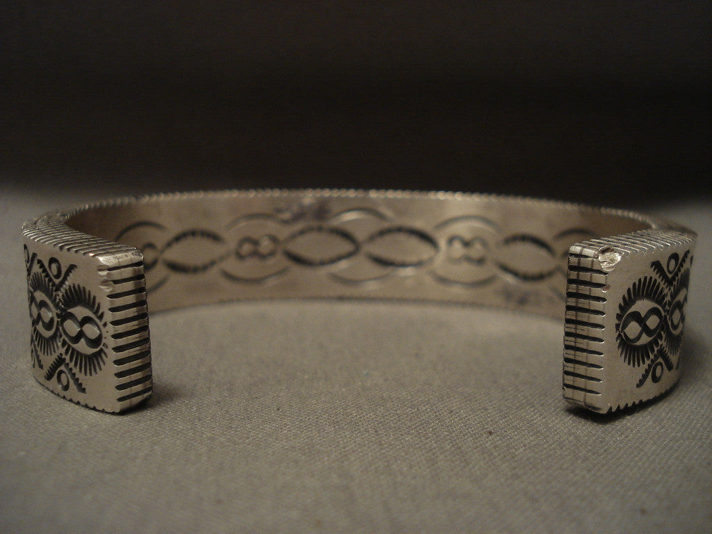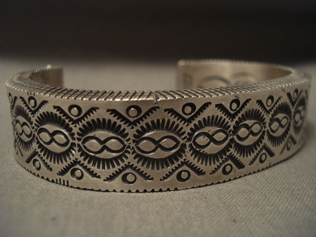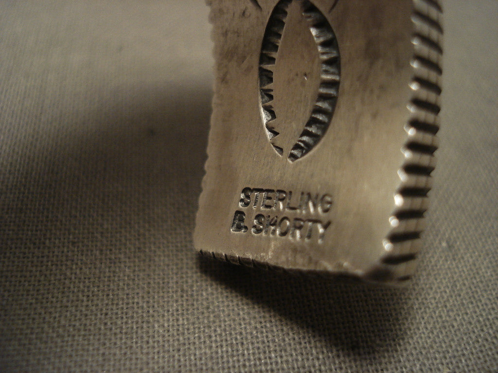 This is a magnificent vintage Navajo heavy stamp silver bracelet. This mind boggling silver bracelet is incredibly heavy, just look at those silver works. It is just amazing how the artist hand stamped all of those silver channels on the ends of the cuff with a remarkable plethora of sun works. The bracelet is so thick, measuring around 1/4" thick! Even the inside of the cuff contains beautiful stamp works. The width of the bracelet measures around 5/8". Signed by Navajo artist, B. Shorty (the Shorty family is very famous for top quality items) . Sterling silver, marked. The inside end to end measures around 5-1/2" with an additional 1-3/4" gap. Sturdy 119 grams. LAYAWAYS- We are happy to work with you and are more flexible than anyone on the net. Simply send us an email for more information.Make Us an Offer- Due to the high demand of our items, many pieces sell quite fast. The most frequent email we receive are from buyers who waited too long to make us an offer and suddenly lost out because another buyer came in and purchased. Send us your reasonable offer today, we are flexible and you have nothing to lose! We also have layaway available and are happy to work with you. Send us an email for more details. Ahéhee’ (Thank you)