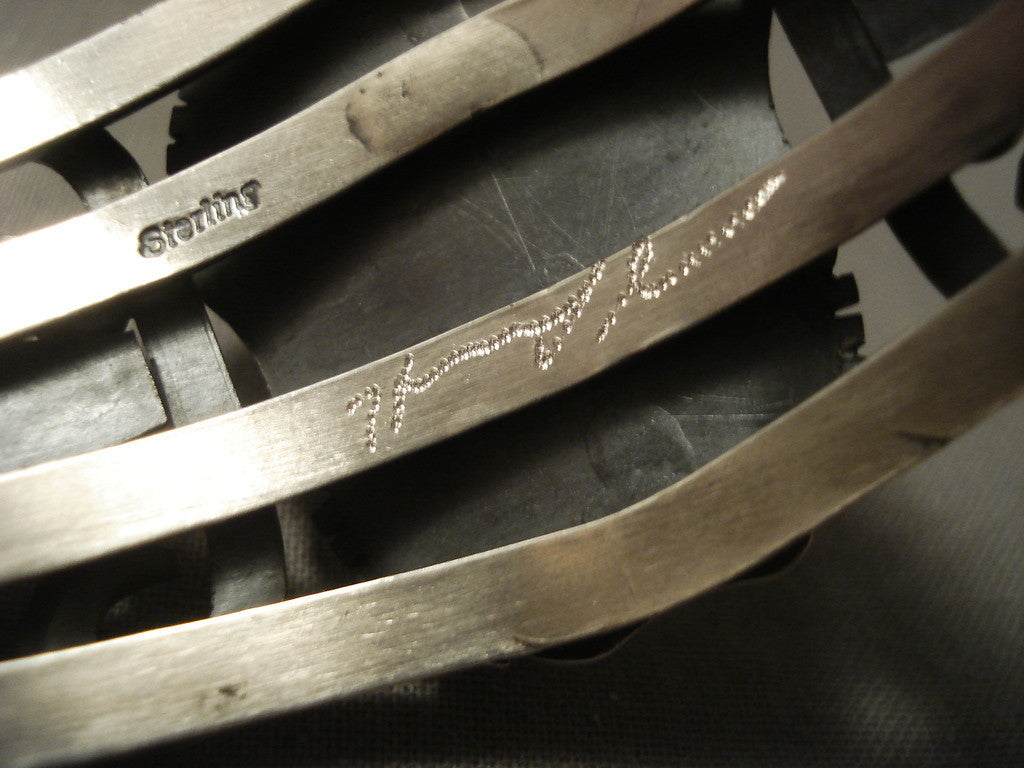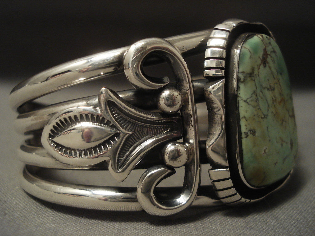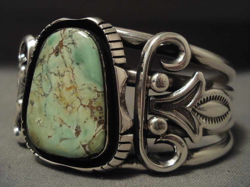 This is a superior vintage Navajo museum quality silver bracelet handmade by the famous artist Herman Vandever. Herman is one of the most talented artists of our time and you can tell by the silver works that this artist is top notch. This bracelet consists of a quadruple silver shank cuff. I just cant get over how beautfiul the silver work is on this piece. Located in the center of the bracelet is an old natural Damale turquoise stone. Damale is a very rare Nevada mine, often misdescribed. However this is natural, high grade and the real deal. The center stone measures around 1" x 3/4". The width of the bracelet measures around 1-1/4". Signed by Navajo artist, Herman Vandever . Sterling silver, marked. Cir. 1980's+. The inside end to end measures around 5-3/4" with an additional 3/4" gap. Sturdy 62 grams. LAYAWAYS- We are happy to work with you and are more flexible than anyone on the net. Simply send us an email for more information.Make Us an Offer- Due to the high demand of our items, many pieces sell quite fast. The most frequent email we receive are from buyers who waited too long to make us an offer and suddenly lost out because another buyer came in and purchased. Send us your reasonable offer today, we are flexible and you have nothing to lose! We also have layaway available and are happy to work with you. Send us an email for more details. Ahéhee’ (Thank you)