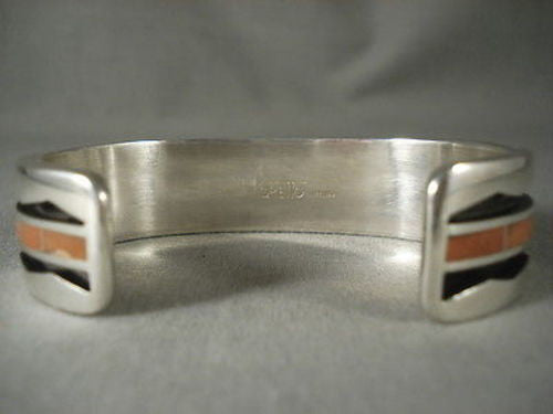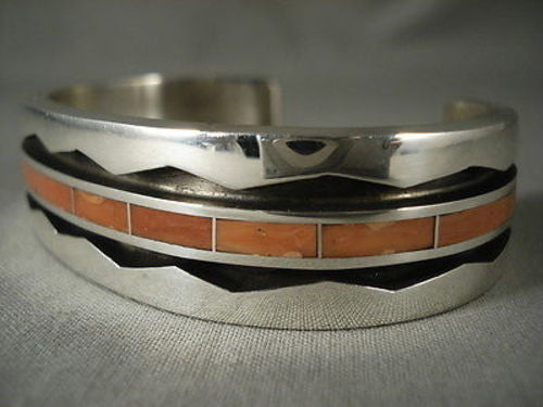 An exquisite vintage Zuni silver bracelet. This 1/8" thick high polish bracelet has a most unique cut-out zigzag design of darker background that stretches from end to end. And down the center of the zigzag also from end to end runs a striking river of gorgeous Mediterranean coral inlay - making quite a statement! The width of the bracelet measures around 3/4". Signed by Zuni artist, Larry Loretto. Sterling silver, marked. Cir. 1990's+. The inside end to end measures around 5-7/8" with an additional 1-3/8" gap. Sturdy 94 grams.