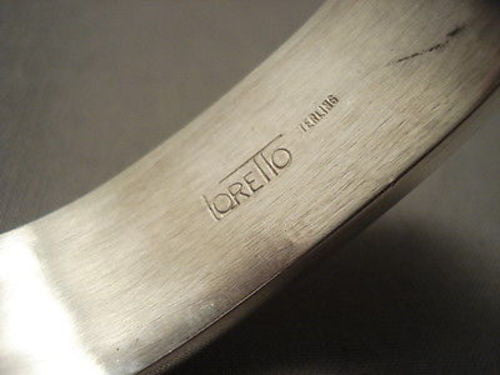 This is a magnificent modernistic Zuni museum quality coral inlay silver bracelet. This piece consists of impeccable advanced coral inlay. The inlay is beautifully set in stunning shadowbox patterns that portray to be mountains. This piece is absolutely phenomenal. The width of the bracelet measures around 3/4". Signed by Zuni artist, Larry Loretto . Sterling silver, marked. Cir. 1990's+. The inside end to end measures around 5-3/4" with an additional 1-1/4" gap. Sturdy 88 grams.