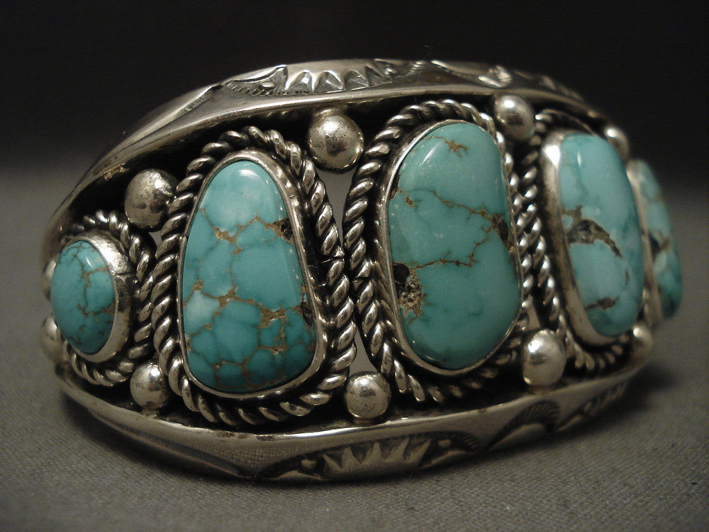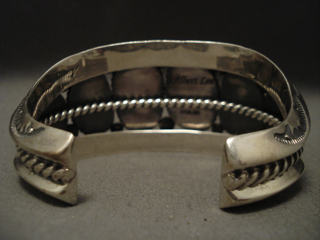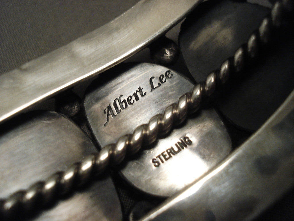 This is an exceptional vintage Navajo musuem quality important silver bracelet containing 6 very rare old Blue Carico Lake turquoise stones. This piece was handmade by the famous Albert Lee who was one of the most talented artists of our time. This is one of his finer and larger bracelets which contains fabulous silver sun works and heavy silver ropes that wonderfully surround the stones. The largest stone measures around 3/4" x 1/2". The width of the bracelet measures around 1-3/8". Signed by Navajo artist, Albert Lee. Sterling silver, marked. Cir. 1980's+. The inside end to end measures around 5-1/2" with an additional 1" gap. Sturdy 115 grams. MAKE US AN OFFER- We like to be flexible! Send us your reasonable offer on this piece(s), you have nothing to lose. The most common email we receive is from buyers who waited too long and someone bought it before they did. LAYAWAYS- Please contact us prior to purchasing and we can work out an easy 0%-interest Paypal/ Money Order lay-a-way plan that fits your budget. (Item must be of $100 value or more).