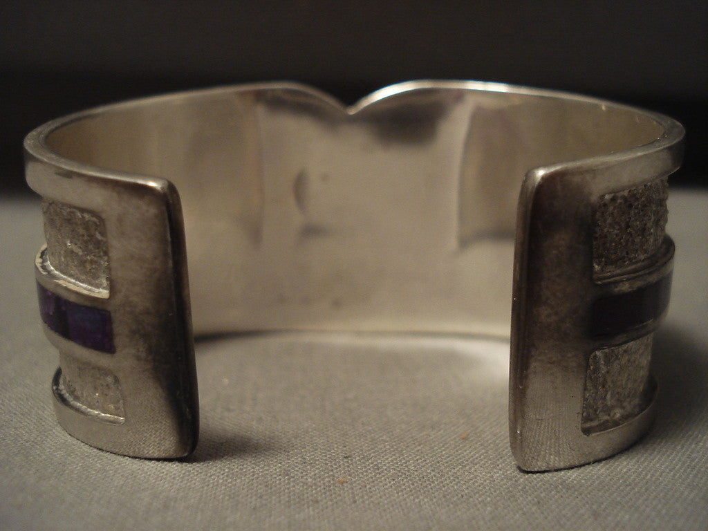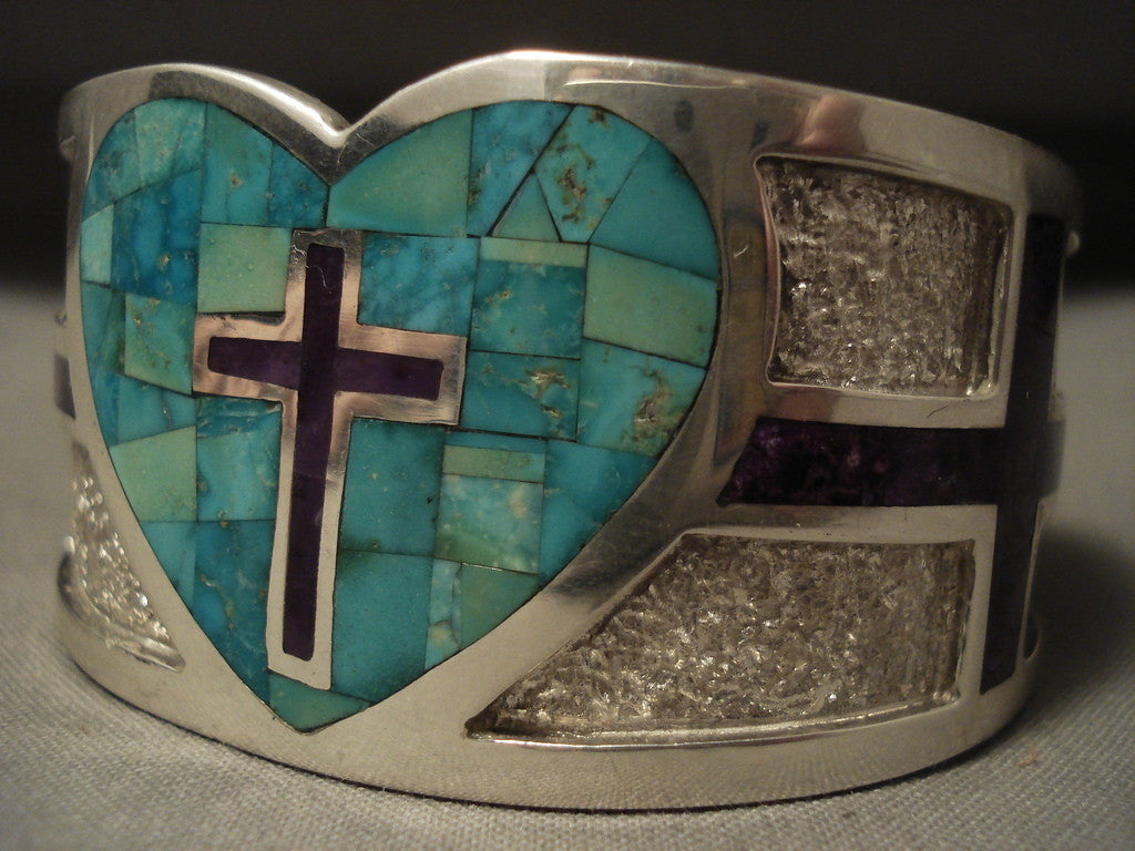 Important Navajo Tommy Moore Natural Turquoise Sugulite Cross Silver Bracelet