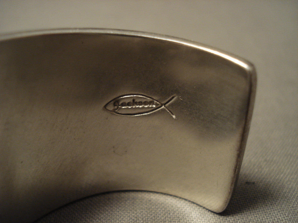 This is a superlative vintage Navajo silver "cross" bracelet handmade by the famous artist Dan Jackson. This piece is beautifully inlaid with amazing turquoise and sugulite stone. The designs includes a wonderful heart, crosses and dotted silver works. The width of the bracelet measures around 1-1/4". Signed by Navajo artist, Dan Jackson . Sterling silver. The inside end to end measures around 5-1/4" with an additional 1" gap. Sturdy 65 grams. LAYAWAYS- We are happy to work with you and are more flexible than anyone on the net. Simply send us an email for more information.