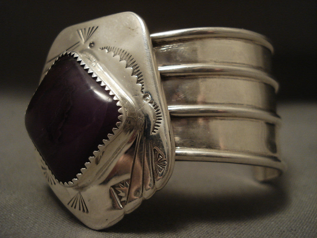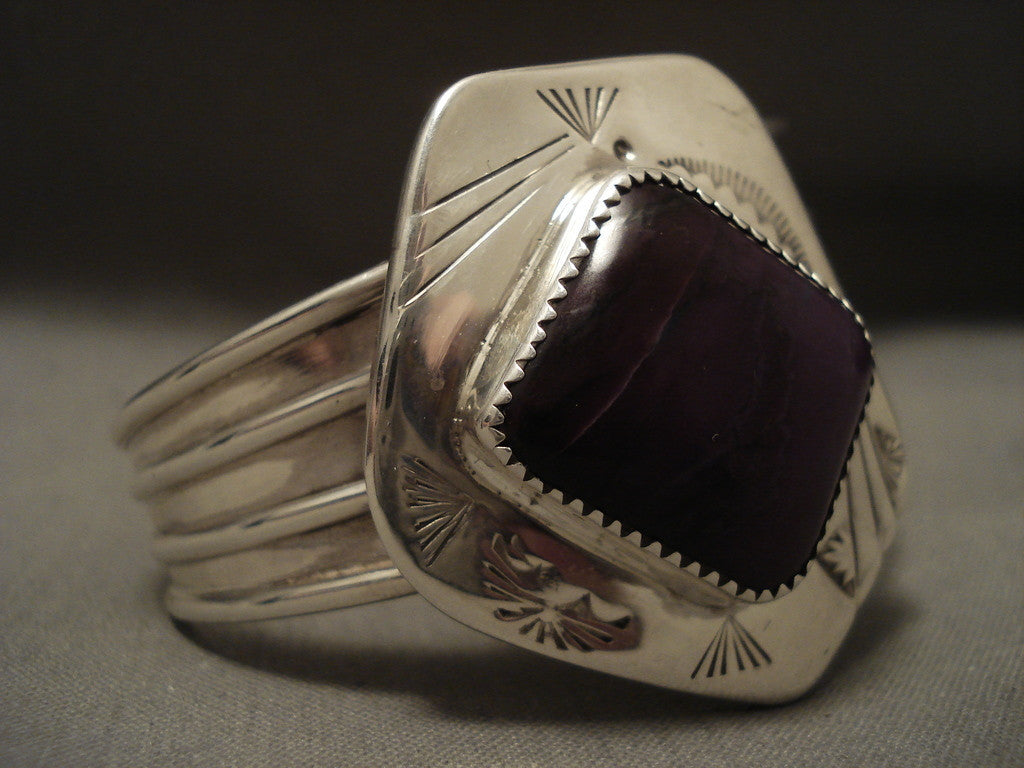 This is a superlative Navajo absolutely incredible increasing shank silver bracelet. This piece contains a fascinating offset rhombus shaped sugulite stone. The cuff beautifully graduates in width from about 3/8" to 1-1/4". Surrounding the stone are beautiful silver sun works. The center stone measures around 1" x 1". Signed by Navajo artist, SR (unique font). Sterling silver, marked. Cir. 1970's+. The inside end to end measures around 5" with an additional 1" gap. Sturdy 32 grams. LAYAWAYS- We are happy to work with you and are more flexible than anyone on the net. Simply send us an email for more information.Make Us an Offer- Due to the high demand of our items, many pieces sell quite fast. The most frequent email we receive are from buyers who waited too long to make us an offer and suddenly lost out because another buyer came in and purchased. Send us your reasonable offer today, we are flexible and you have nothing to lose! We also have layaway available and are happy to work with you. Send us an email for more details. Ahéhee’ (Thank you)