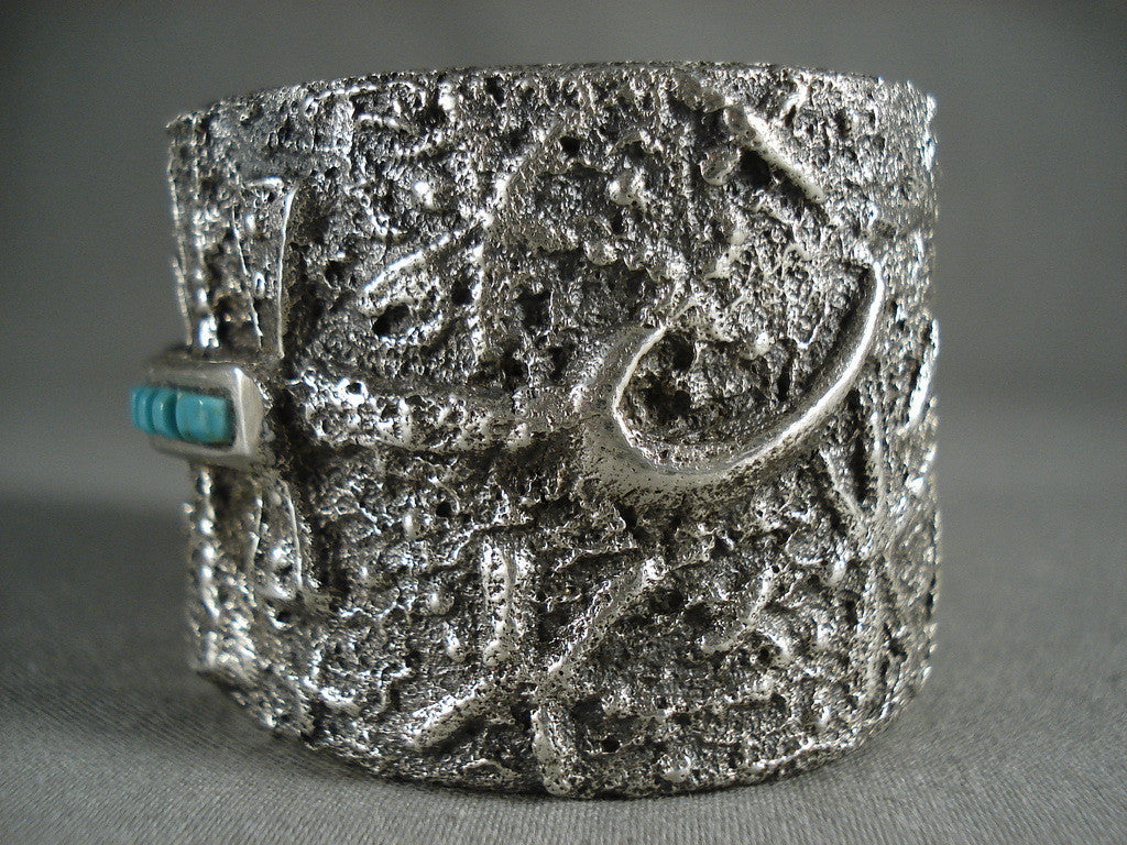 Intense And Advanced Modernistic Navajo Yei Turquoise Silver Tufa Bracelet