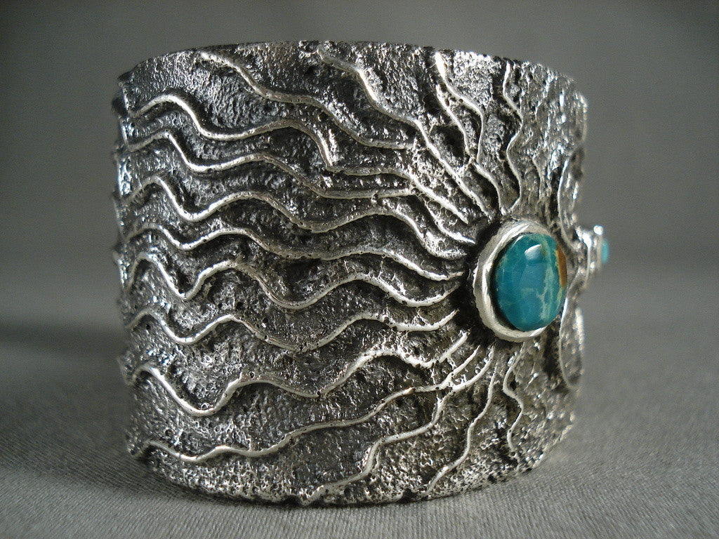 This is an exceptional vintage Navajo silver bracelet. Against a thick wave silver backdrop, mother nature's creatures including peaceul dragonflies are depicted - with accents of a large Royston turquoise stone and four turquoise squares lining up side by side to create the body of the large dragonfly at the front. This thick, dramatic bracelet is designed to be admired fitting close to the wrist. The largest stone measures around 3/8" x 3/8". The width of the bracelet measures around 1-1/2". Signed by Navajo artist, S. Billie. Sterling silver. The inside end to end measures around 5-1/8" with an additional 1-1/8" gap. Sturdy 148 grams. LAYAWAYS- We are happy to work with you and are more flexible than anyone on the net. Simply send us an email for more information.
