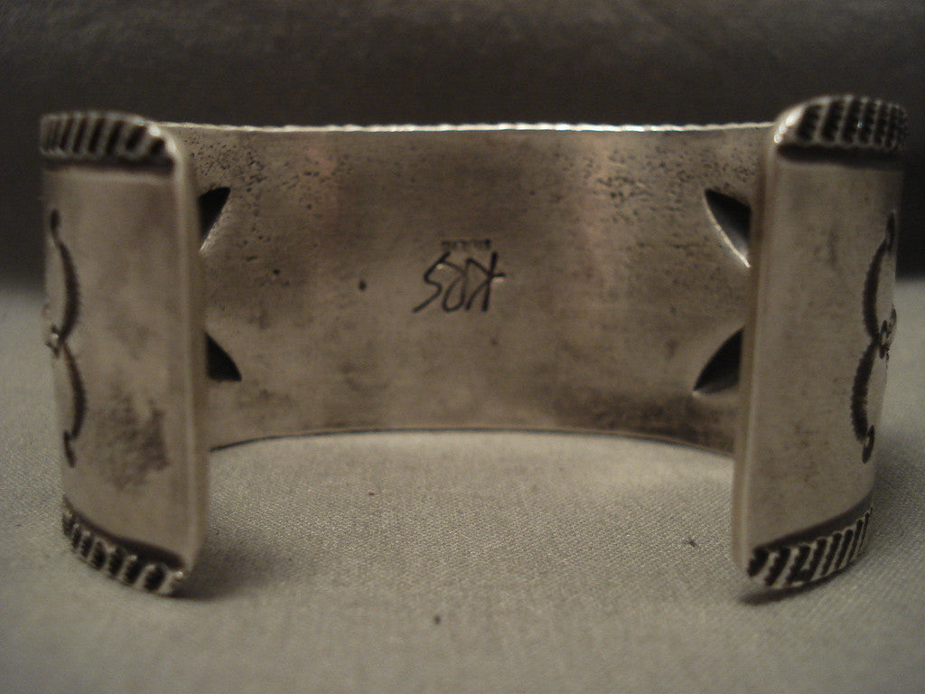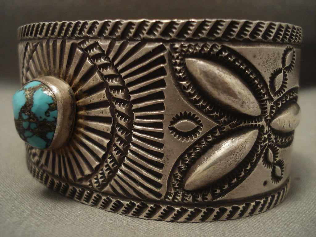 This is a museum quality vintage Navajo intense silver work silver bracelet. Look how close and precise these silver works are. The artist had to hand chisel each and every one of them. Resting in the center is a wonderful spiderweb turquoise stone that appears to be from the Damale mine which is a rare Nevada mine. Resting on the ends are superior hand repoussed silver shells. The center stone measures around 1/2" x 1/2". The width of the bracelet measures around 1-1/4". Signed by Navajo artist, Kris Billie . Sterling silver, marked. The inside end to end measures around 5-1/2" with an additional 1-1/4" gap. Sturdy 95 grams. LAYAWAYS- We are happy to work with you and are more flexible than anyone on the net. Simply send us an email for more information.Make Us an Offer- Due to the high demand of our items, many pieces sell quite fast. The most frequent email we receive are from buyers who waited too long to make us an offer and suddenly lost out because another buyer came in and purchased. Send us your reasonable offer today, we are flexible and you have nothing to lose! We also have layaway available and are happy to work with you. Send us an email for more details. Ahéhee’ (Thank you)