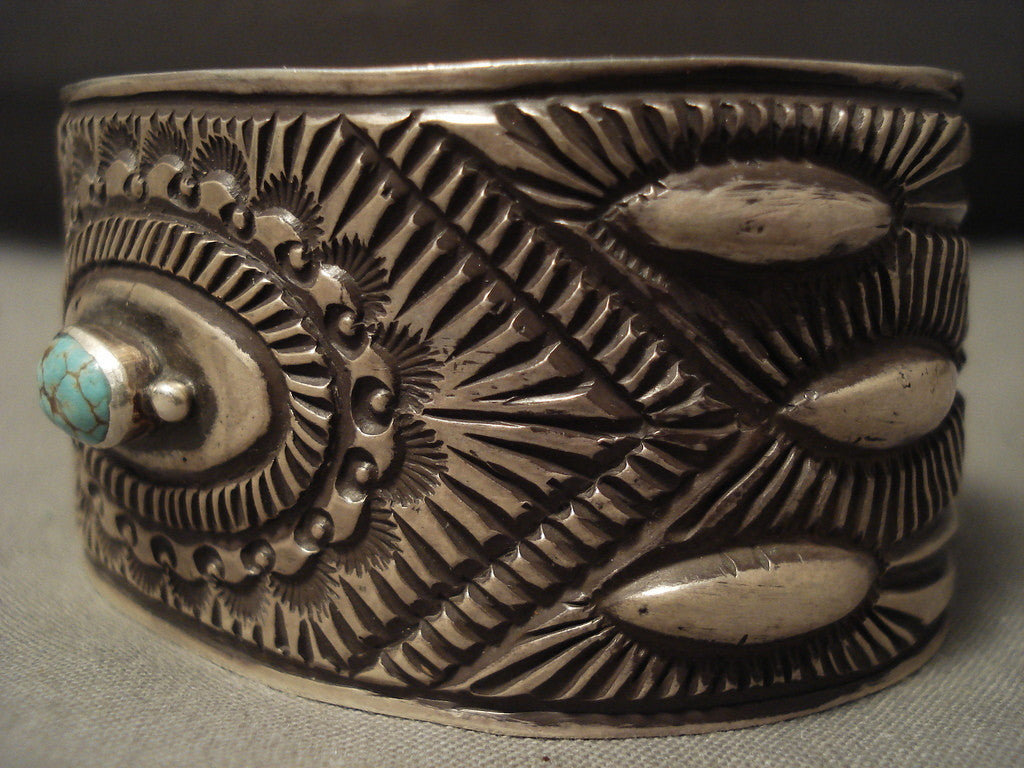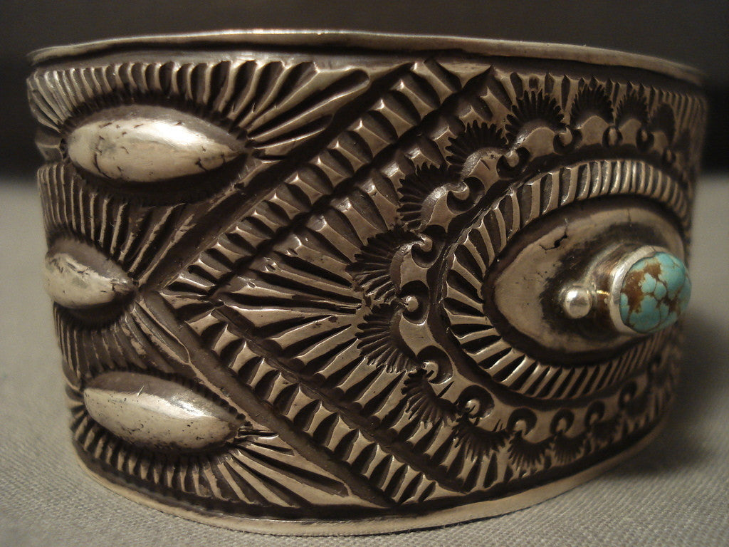 This is an incredible vintage Navajo extreme detailed silver bracelet. Check out how precise those stamp works are, just perfect. The artist must have spent a ton of time of this because the entire piece is just amazing. The bracelet consists of wonderful hand repoussed silver patterns. Resting in the center of the heavy and thick silver cuff is a superior Royston turquoise stone. The center stone measures around 3/8" x 3/16". The width of the bracelet measures around 1-1/4". Signed by Navajo artist, KRS. Sterling silver, marked. The inside end to end measures around 5-1/2" with an additional 1-1/4" gap. Sturdy 94 grams. LAYAWAYS- We are happy to work with you and are more flexible than anyone on the net. Simply send us an email for more information.