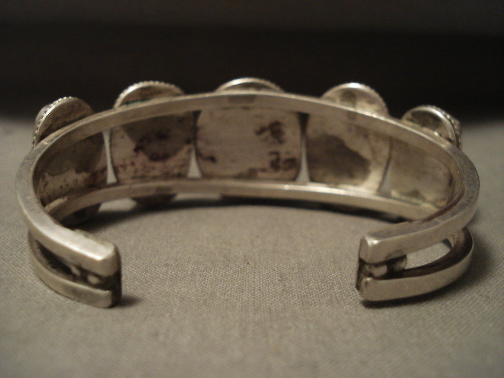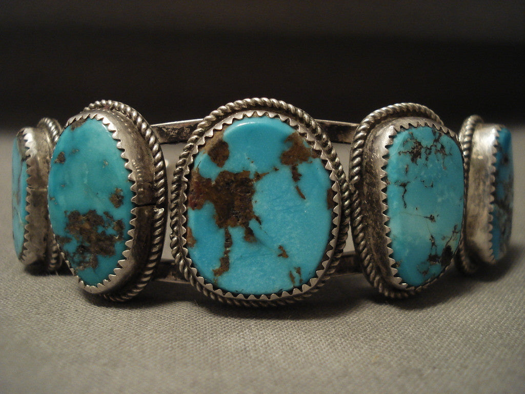 This is an exceptional vintage Navajo turquoise bracelet. This piece contains five phenomenal and large Bisbee turquoise stones. What is so unique about this piece is that the double silver shank cuff is a rare shape, they are beautiful rectangular shapes. Surrounding each turquoise stone are impeccable silver ropes. The center stone measures around 3/4" x 5/8". The width of the bracelet measures around 3/4". Signed by Navajo artist, BLW. Sterling silver. Cir. 1960's+. The inside end to end measures around 5-1/2" with an additional 1" gap. Sturdy 49 grams. LAYAWAYS- We are happy to work with you and are more flexible than anyone on the net. Simply send us an email for more information.Make Us an Offer- Due to the high demand of our items, many pieces sell quite fast. The most frequent email we receive are from buyers who waited too long to make us an offer and suddenly lost out because another buyer came in and purchased. Send us your reasonable offer today, we are flexible and you have nothing to lose! We also have layaway available and are happy to work with you. Send us an email for more details. Ahéhee’ (Thank you)