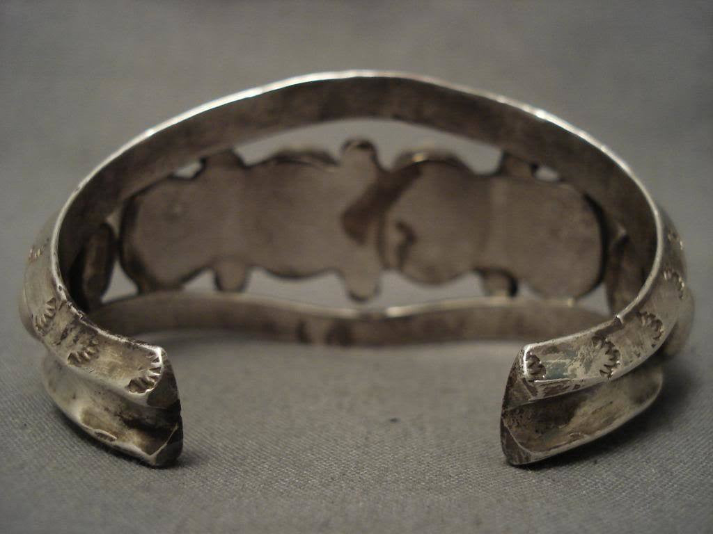 This is a monumental very early and old Navajo silver bracelet containing four very rare natural Persian turquoise stones. This piece consists of a very heavy silver cuff with intricate bordering sun patterns. Resting throughout the piece are colossal silver raindrops. The center stone measures around 5/8" x 7/16". The width of the bracelet measures around 1-5/8". Sterling silver. Cir. 1930's+. The inside end to end measures around 5-1/2" with an additional 1" gap. Sturdy 78 grams. MAKE US AN OFFER- We like to be flexible! Send us your reasonable offer on this piece(s), you have nothing to lose. The most common email we receive is from buyers who waited too long and someone bought it before they did. LAYAWAYS- Please contact us prior to purchasing and we can work out an easy 0%-interest Paypal/ Money Order lay-a-way plan that fits your budget. (Item must be of $100 value or more).