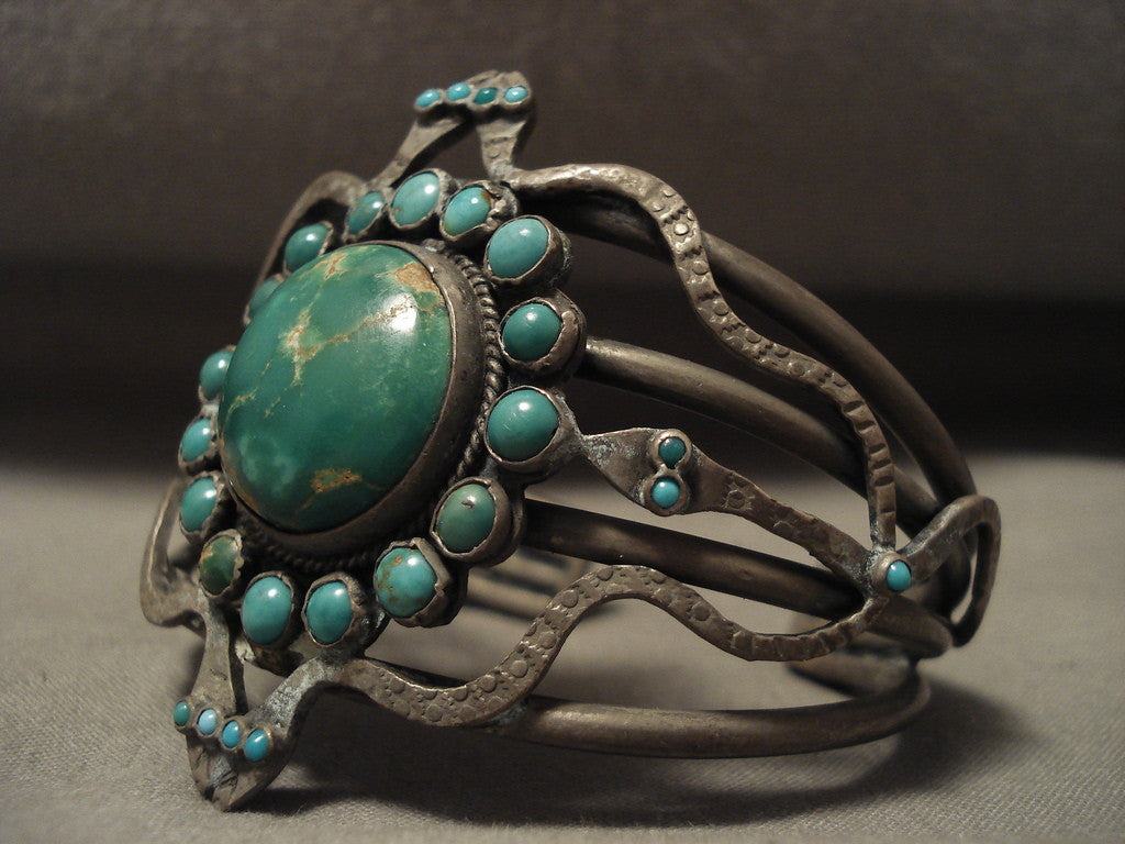 This is a monumental vintage Navajo late 1800's/ early 1900's silver bracelet. This piece contains impeccable petite point Cerrillos turquoise stones that surround a fabulous huge center Cerrillos turquoise stone. Bordering the satellite cluster of stones are impeccable handmade silver snakes that slither throughout the bracelet with wonderful petit point turquoise as their eyes. This bracelet contains such incredible and natural old patina. This heavy five silver shank bracelet is incredibly old. The center stone measures around 7/8" x 7/8". The width of the bracelet measures around 1-1/2". Sterling silver. Cir. late 1800's/ early 1900's. The inside end to end measures around 5-1/2" with an additional 1" gap. Sturdy 70 grams. LAYAWAYS- We are happy to work with you and are more flexible than anyone on the net. Simply send us an email for more information.Make Us an Offer- Due to the high demand of our items, many pieces sell quite fast. The most frequent email we receive are from buyers who waited too long to make us an offer and suddenly lost out because another buyer came in and purchased. Send us your reasonable offer today, we are flexible and you have nothing to lose! We also have layaway available and are happy to work with you. Send us an email for more details. Ahéhee’ (Thank you)