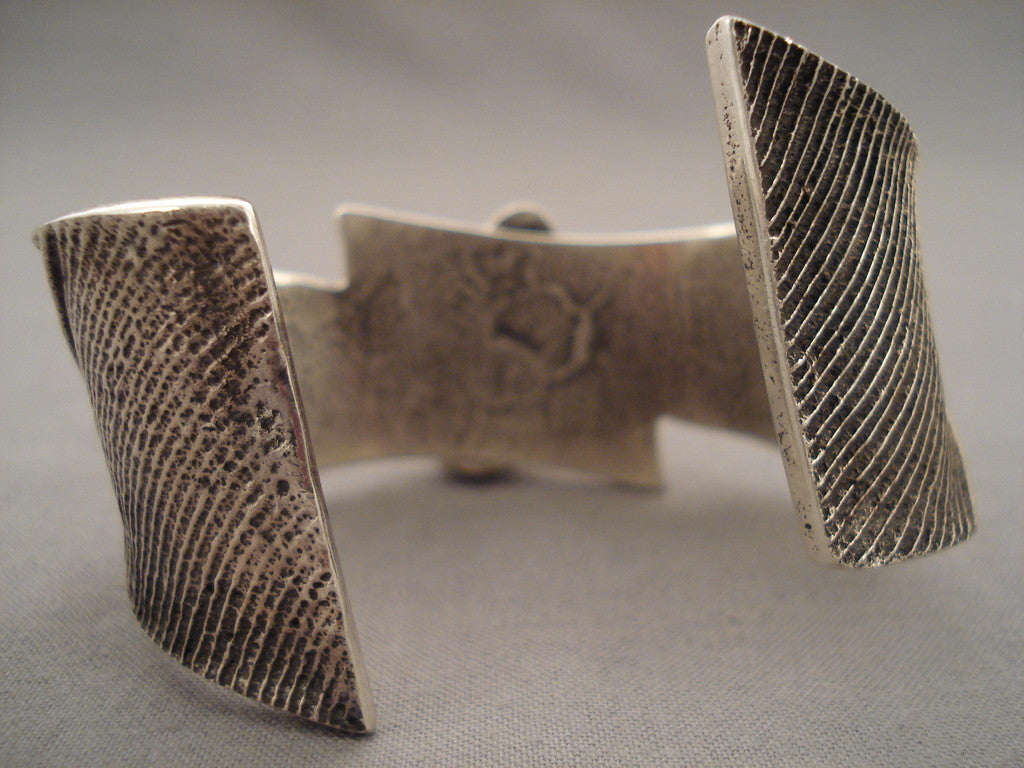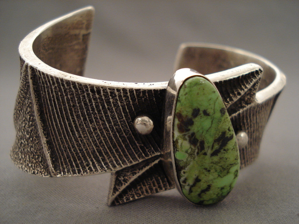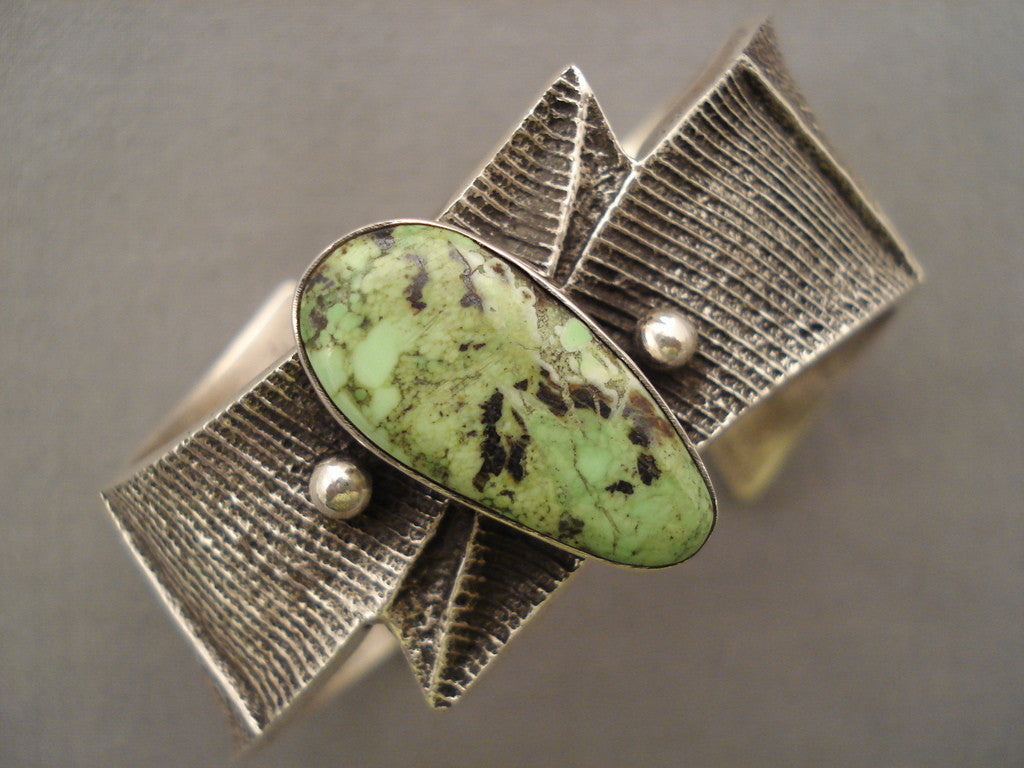 Here we have an exquisite Navajo silver bracelet with a light green turquoise teardrop and two handcarved silver beads on a heavy, handcarved silver ribbon cuff! The center stone measures around 1" x 1/2". The width of the bracelet measures around 1-1/4". Signed by Navajo artist, E. Jones. Sterling silver, marked. The inside end to end measures around 5" with an additional 1-1/8" gap. Sturdy 78 grams. LAYAWAYS- We are happy to work with you and are more flexible than anyone on the net. Simply send us an email for more information.Make Us an Offer- Due to the high demand of our items, many pieces sell quite fast. The most frequent email we receive are from buyers who waited too long to make us an offer and suddenly lost out because another buyer came in and purchased. Send us your reasonable offer today, we are flexible and you have nothing to lose! We also have layaway available and are happy to work with you. Send us an email for more details. Ahéhee’ (Thank you)