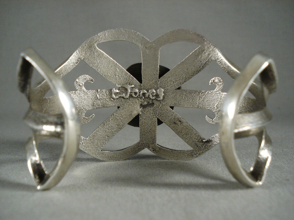 This is a tremendous vintage Navajo silver bracelet. Swirling beveled silver bars create the scalloped frame, while X marks the spot for this large beautiful lime green turquoise stone at the very heart of this cast silver bracelet. The stone has impressive brown matrix to it. Details of the bracelet include how the artist set 3 silver rounds just to the one side of the stone, the placement of the silver hooks at either side and how the cast fishtails at the terminals. Quite an impressive look upon the wrist! The center stone measures around 1" x 7/8". The width of the bracelet measures around 2". Signed by Navajo artist, E. Jones. Sterling silver. The inside end to end measures around 6" with an additional 1-3/8" gap. Sturdy 86 grams. LAYAWAYS- We are happy to work with you and are more flexible than anyone on the net. Simply send us an email for more information.
