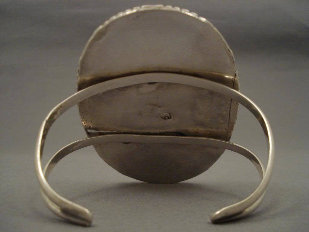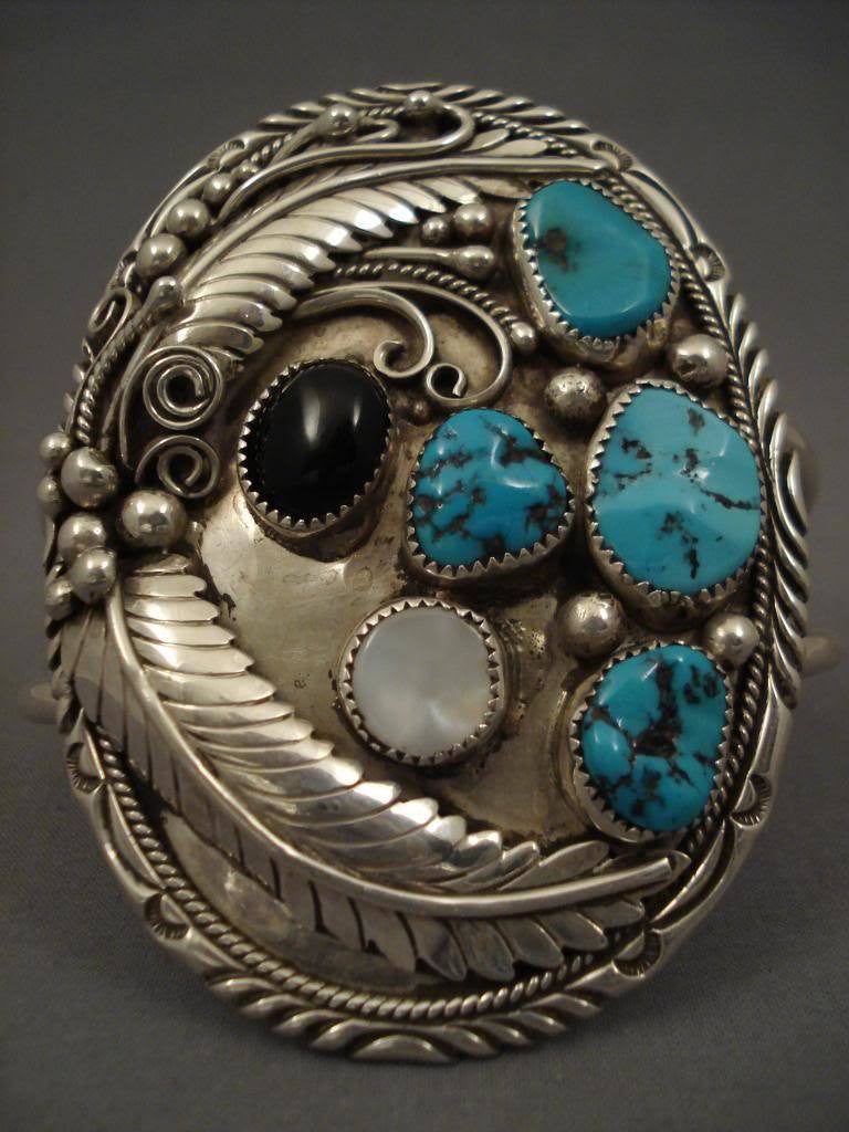 Up for sale is this magnificent vintage Navajo/Hopi silver oval bracelet having 4 Old Kingman turquoise stones, jet and mother of pearl surrounded by hand wrought silver leaves, stems, berries and border! The bracelet has a double silver rail cuff! The width of the bracelet measures around 3-3/8". Signed by Hopi artist, Fred Batala. Sterling silver, marked. Cir. 1970's+. The inside end to end measures around 7" with an additional 1-1/4" gap. Sturdy 99 grams. MAKE US AN OFFER- We like to be flexible! Send us your reasonable offer on this piece(s), you have nothing to lose. The most common email we receive is from buyers who waited too long and someone bought it before they did. LAYAWAYS- Please contact us prior to purchasing and we can work out an easy 0%-interest Paypal/ Money Order lay-a-way plan that fits your budget. (Item must be of $100 value or more).
